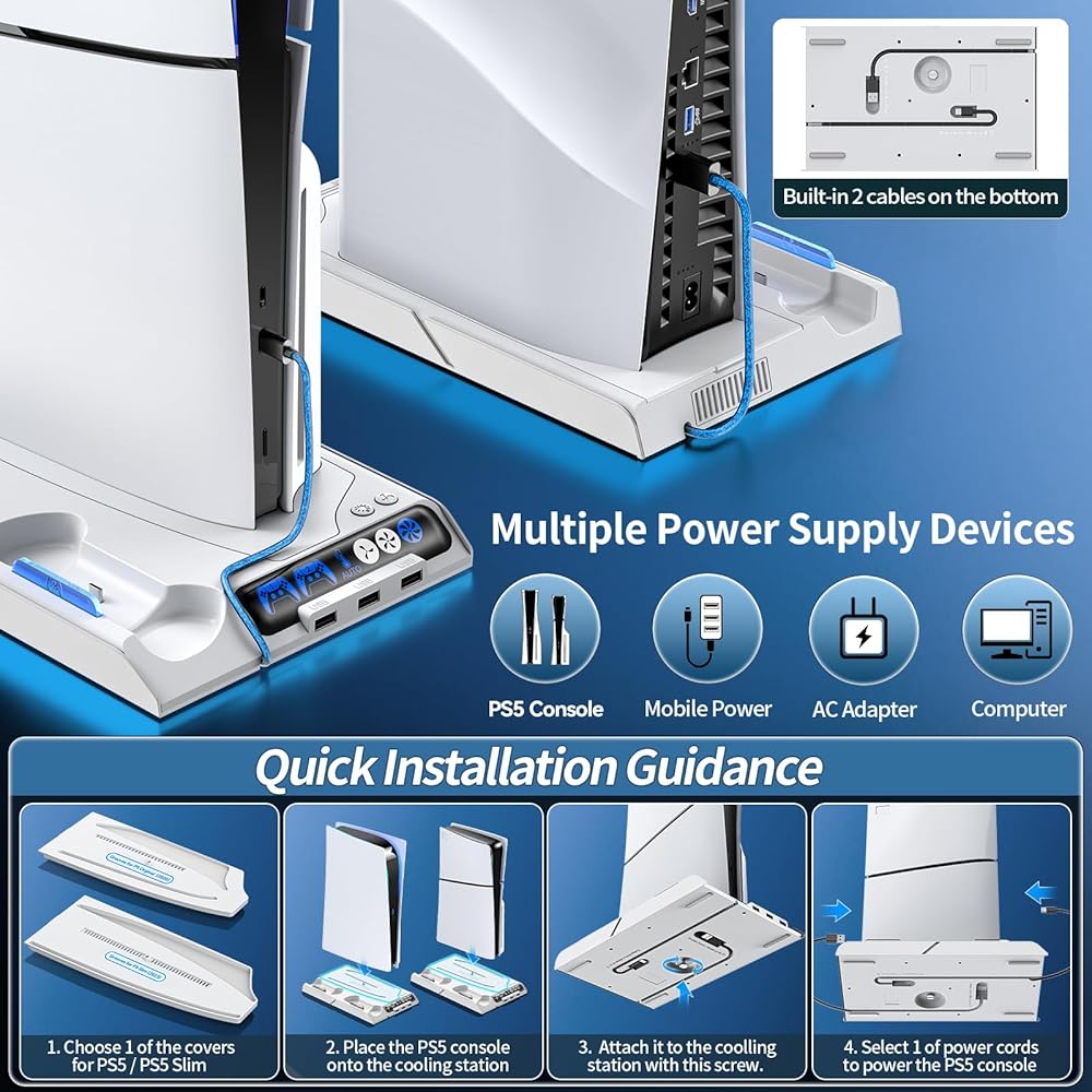 • 2023 PS5 SLIM & 2020 PS5 CONSOLE - تم تصميم حامل ملحقات PS5 لأجيال PS5، حيث يضم قرص PS5 Slim Disc & Digital الأنيق لعام 2023 ونماذج PS5 Disc & Digital الكلاسيكية لعام 2020، والتي يمكنها الحصول على الطاقة من أجهزة إمداد طاقة متعددة، مثل وحدة تحكم PS5 وكمبيوتر شخصي وUSB HUB ومأخذ حائط ومحول تيار متردد. كابلان مخفيان مدمجان، يمكنك اختيار أي منهما للحصول على مصدر الطاقة عن طريق توصيله بالجزء الأمامي أو الخلفي لوحدة التحكم PS5.