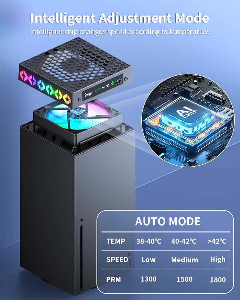 ضبط تلقائي لمروحة التبريد: مع شريحة ذكية مدمجة، تقوم مروحة التبريد لملحقات سلسلة xbox x بضبط سرعتها تلقائيًا وفقًا لدرجة حرارة وحدة التحكم الخاصة بك، مما يضمن التبريد الأمثل دون تعديل يدوي. عند الدخول لأول مرة في وضع التحكم الذكي في درجة الحرارة، ستدور مروحة التبريد لمدة 5 ثوانٍ بغض النظر عن درجة الحرارة، ثم تقوم تلقائيًا بضبط حالة عملها بذكاء وفقًا لدرجة الحرارة التي يستشعرها مستشعر درجة الحرارة.