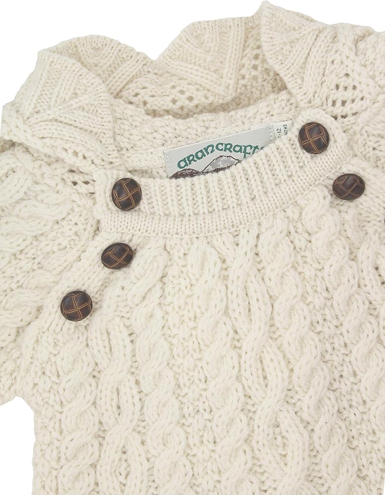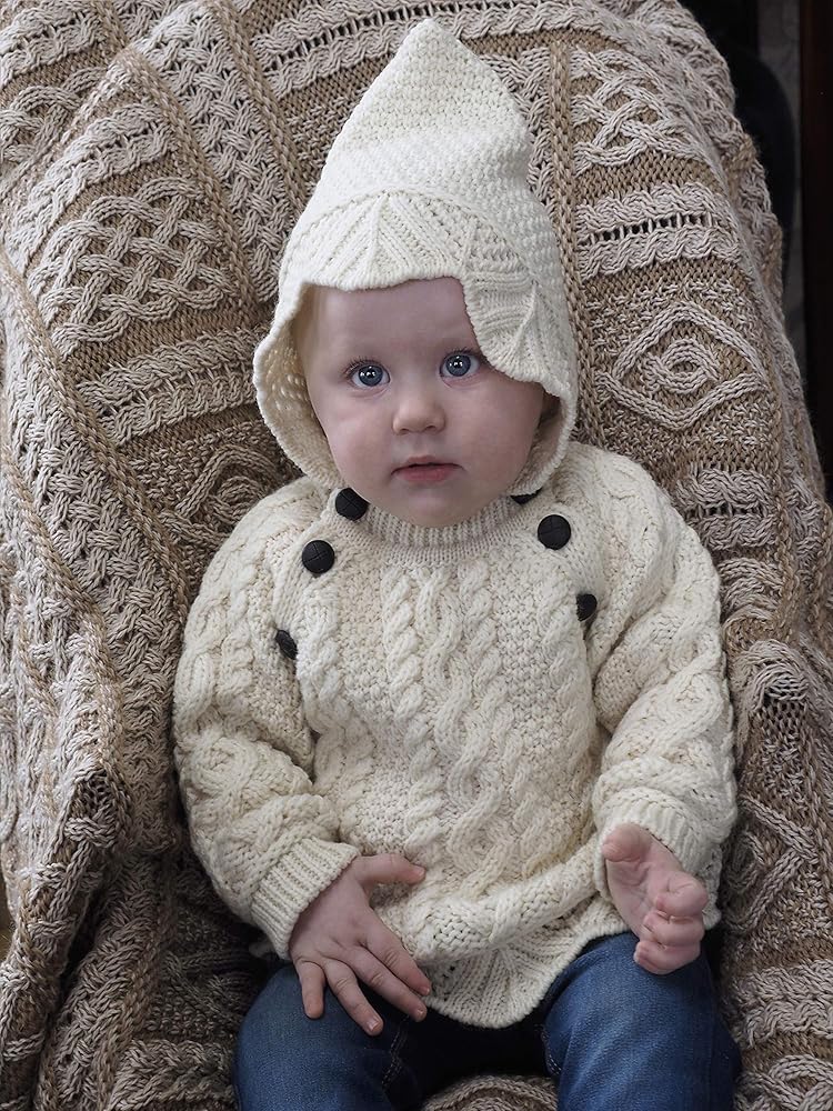 الموضة الأيرلندية التقليدية: مع تفاصيل خياطة الدانتيل الجميلة حول القلنسوة وأيضًا على ضلع السترة، تستخدم هذه السترة خياطة آران التقليدية في كل مكان، مما يشيد بالتاريخ الأيرلندي الغني لجزر آران. تم تصميمها مع أخذ عملائنا الصغار في الاعتبار، كما حرصنا أيضًا على دمج عناصر عملية مثل الفتحة الواسعة، مع إضافة أزرار كرة القدم على طول الرقبة، لسهولة التغيير.