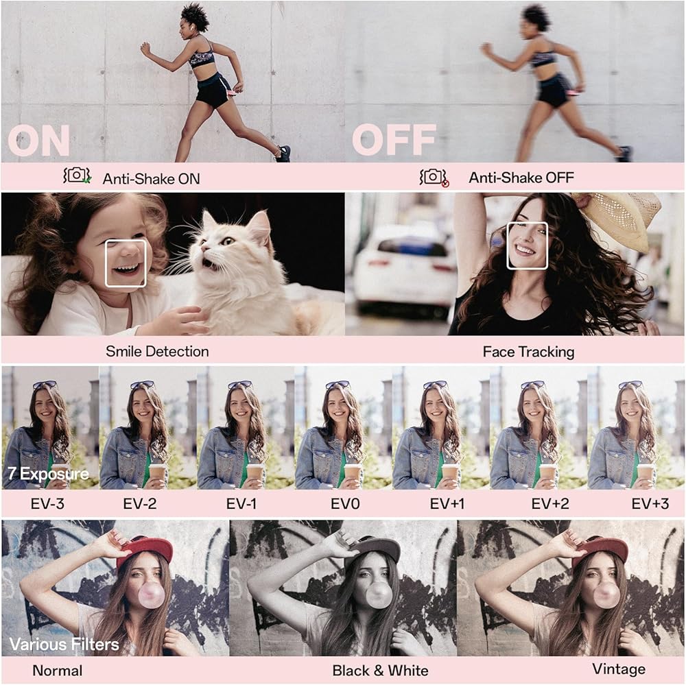 • 🎥 تثبيت الصورة واكتشاف الوجه - تتميز هذه الكاميرا الرقمية للأطفال بوظائف عملية مثل مقاومة الاهتزاز وتتبع الوجه واكتشاف الابتسامة من أجل التقاط سلس. فهو يوفر 20 خيارًا للتصفية ويدعم إعدادات مثل التجميل وتوازن اللون الأبيض والتعرض والحدة والجودة وحساسية ISO لتلبية احتياجات التصوير الفوتوغرافي الخاصة بك. يمكنك ضبط مؤقت للإغلاق التلقائي، وإضافة الطوابع الزمنية، وتبديل صوت الزر، مما يعزز راحة هذه الكاميرا الرقمية للأطفال