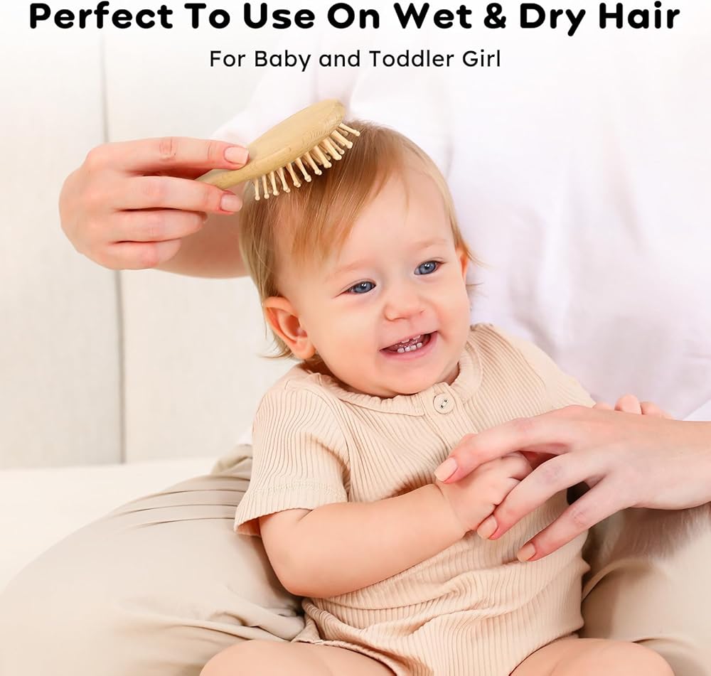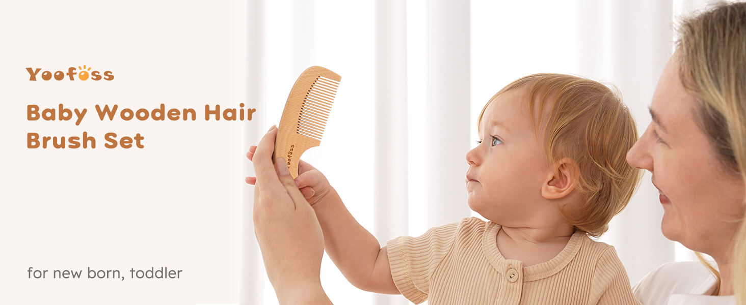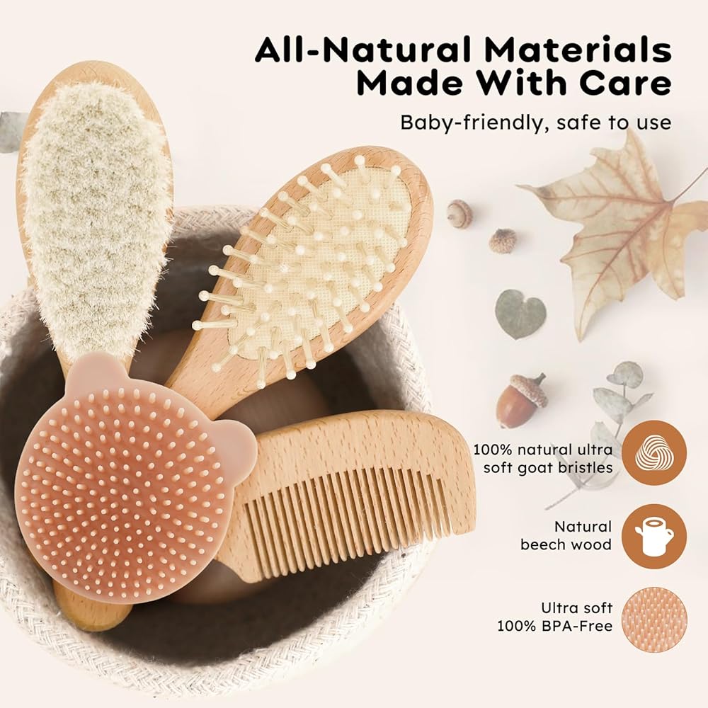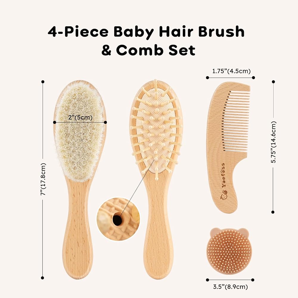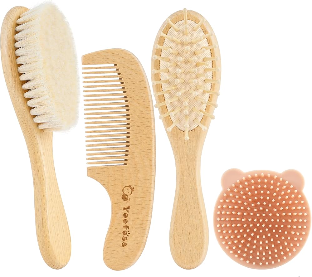 مجموعة مشط وفرشاة شعر الأطفال من يوفوس، مكونة من 4 قطع لحديثي الولادة والأطفال الصغار، فرشاة شعر خشبية للأطفال مع شعر ماعز طبيعي فائق النعومة، مجموعة مشط للأطفال للأولاد والبنات، فرشاة غطاء المهد للأطفال الرضع