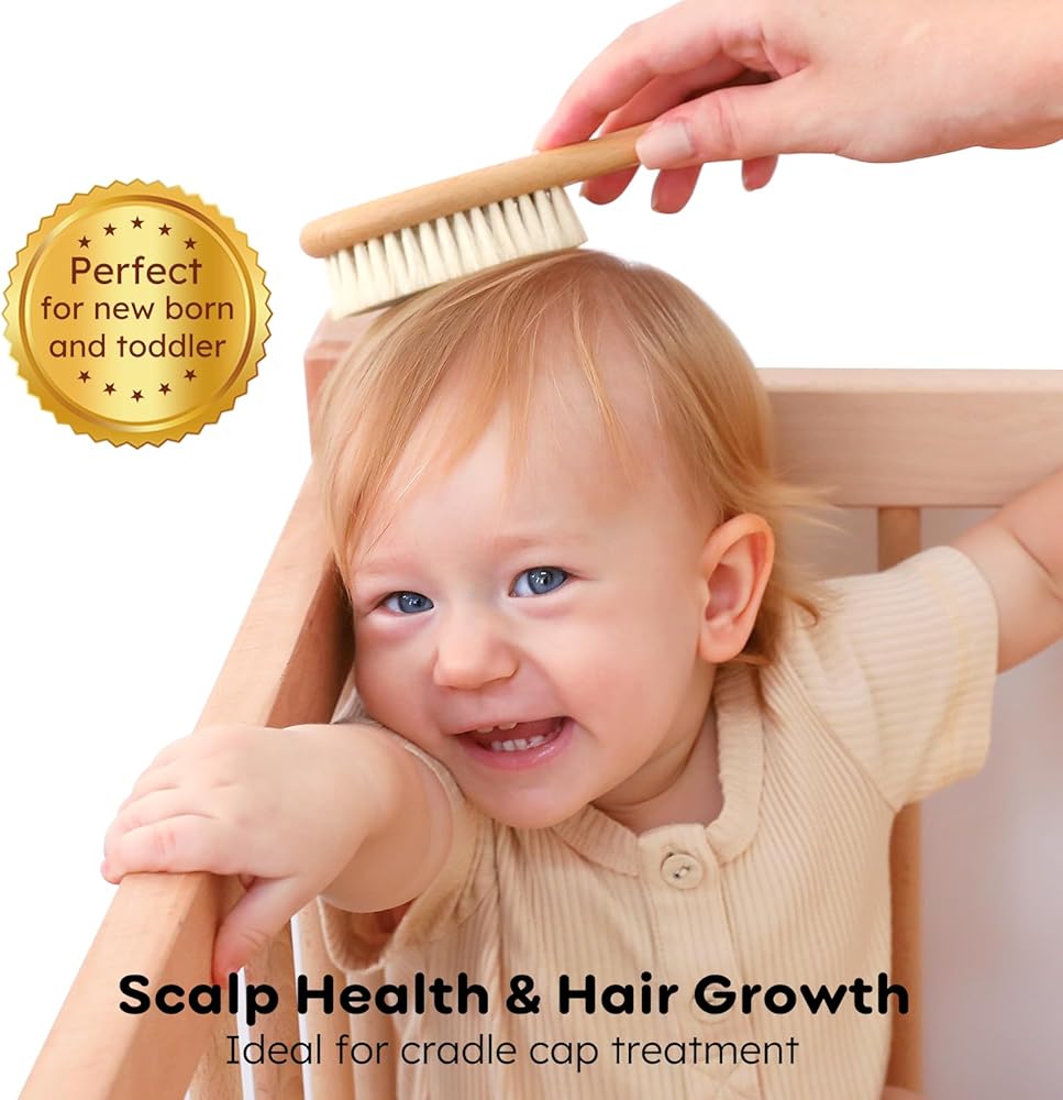 تمنع غطاء المهد: فرشاة شعر الماعز الطبيعية الموجودة في مجموعة فرش شعر الأطفال الخاصة بنا مثالية لمنع غطاء المهد وتعزيز نمو الشعر الصحي. تساعد شعيراتها الناعمة على توزيع الزيوت الطبيعية بالتساوي، مما يحافظ على تغذية فروة رأس طفلك وخالية من البقع الجافة والمتقشرة.