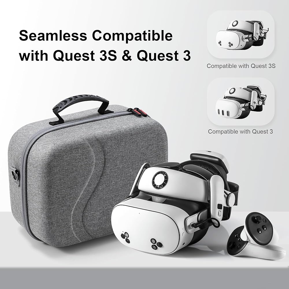 حقيبة الحمل لـ Meta Quest 3S/Quest 3: تم تصميم حقيبة الحمل هذه خصيصًا لسماعات الرأس Meta Quest 3S/Quest 3 VR وغيرها من الملحقات. متوافق مع جميع أحزمة الرأس الخارجية، يناسب حزام رأس البطارية BOBOVR S3 Pro وKiwi Design