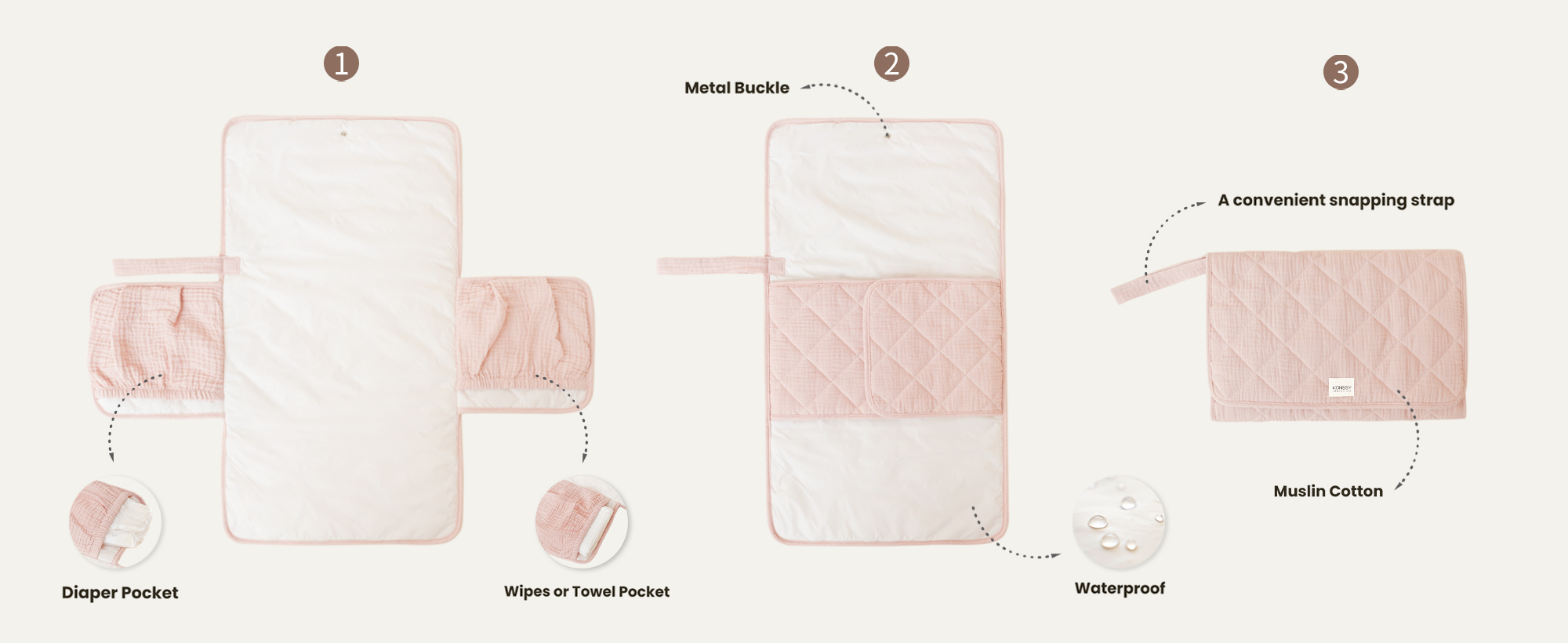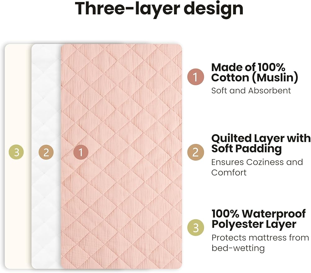 ناعم وخفيف الوزن: مصنوع من ثلاث طبقات من المواد الفاخرة، بما في ذلك الطبقة العلوية الناعمة المصنوعة من القطن (الموسلين) بنسبة 100%، وبطانة مبطنة للراحة، وطبقة سفلية من البوليستر المقاوم للماء بنسبة 100%. قل وداعًا للأسطح الصلبة والمتسخة في محطات تغيير الملابس العامة