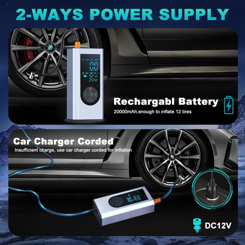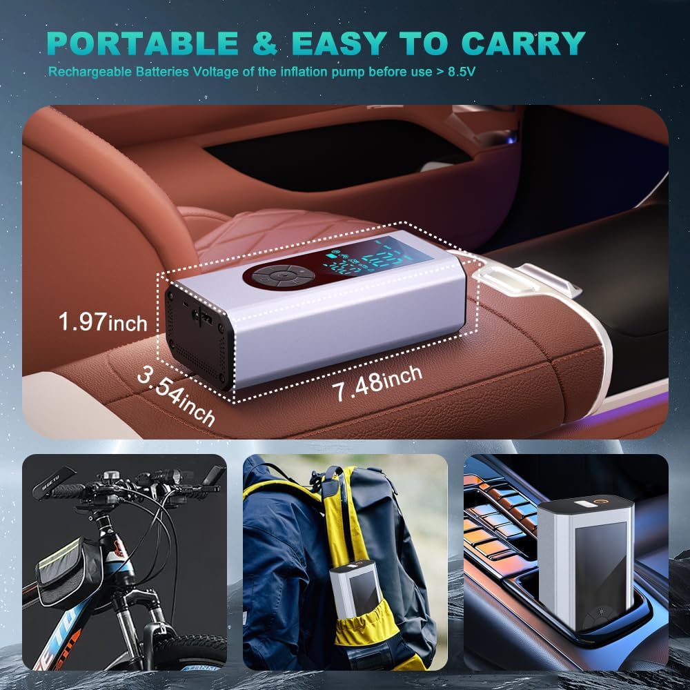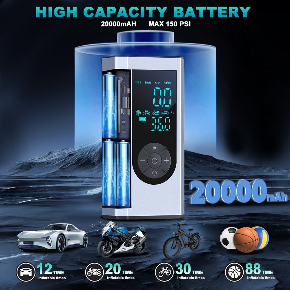 [نفخ الإطارات بشكل أسرع 3 مرات] ضاغط الهواء مدمج ببطارية ليثيوم عالية السعة 20000 مللي أمبير في الساعة (3 بطاريات قابلة لإعادة الشحن). ضغط الشحن يصل إلى 150 رطل لكل بوصة مربعة؛ من 0PSI إلى 36PSI فقط في 6 دقائق. يمكن لمضخة الهواء هذه نفخ 12 إطار سيارة/20 إطار دراجة نارية/30 إطار دراجة/88 كرة سلة تحت الشحن الكامل. نطاق قوي، يمكنه نفخ العديد من الأجهزة القابلة للنفخ. سرعة نفخ سريعة، أسرع 3 مرات من أجهزة النفخ العادية. مريحة للحياة اليومية والسفر.
