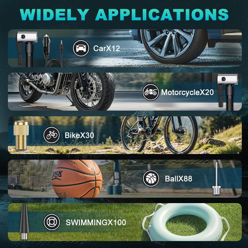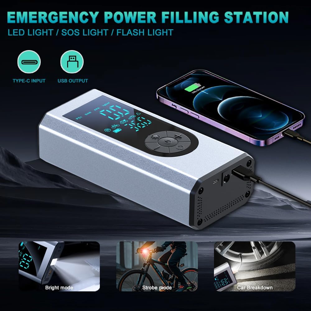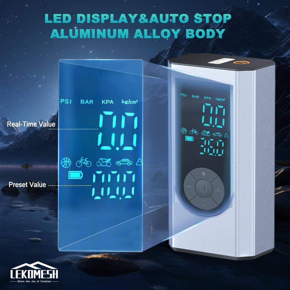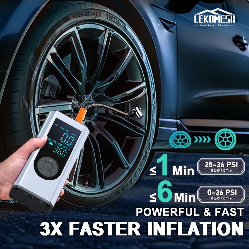 [نفخ الإطارات بشكل أسرع 3 مرات] ضاغط الهواء مدمج ببطارية ليثيوم عالية السعة 20000 مللي أمبير في الساعة (3 بطاريات قابلة لإعادة الشحن). ضغط الشحن يصل إلى 150 رطل لكل بوصة مربعة؛ من 0PSI إلى 36PSI فقط في 6 دقائق. يمكن لمضخة الهواء هذه نفخ 12 إطار سيارة/20 إطار دراجة نارية/30 إطار دراجة/88 كرة سلة تحت الشحن الكامل. نطاق قوي، يمكنه نفخ العديد من الأجهزة القابلة للنفخ. سرعة نفخ سريعة، أسرع 3 مرات من أجهزة النفخ العادية. مريحة للحياة اليومية والسفر.