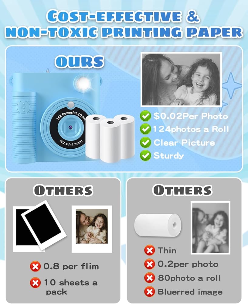 • 【طباعة فورية وسهلة الاستخدام】كاميرا الطباعة الفورية YKSLEMON هي جهاز آمن وسهل الاستخدام للأطفال لالتقاط الصور دون إضافة حبر. مع 3 لفات من الورق الحراري التي يمكنها طباعة ما يقرب من 372 صورة، يمكن للأطفال التقاط العديد من الصور كما يريدون وتجربة متعة الطباعة الفورية!