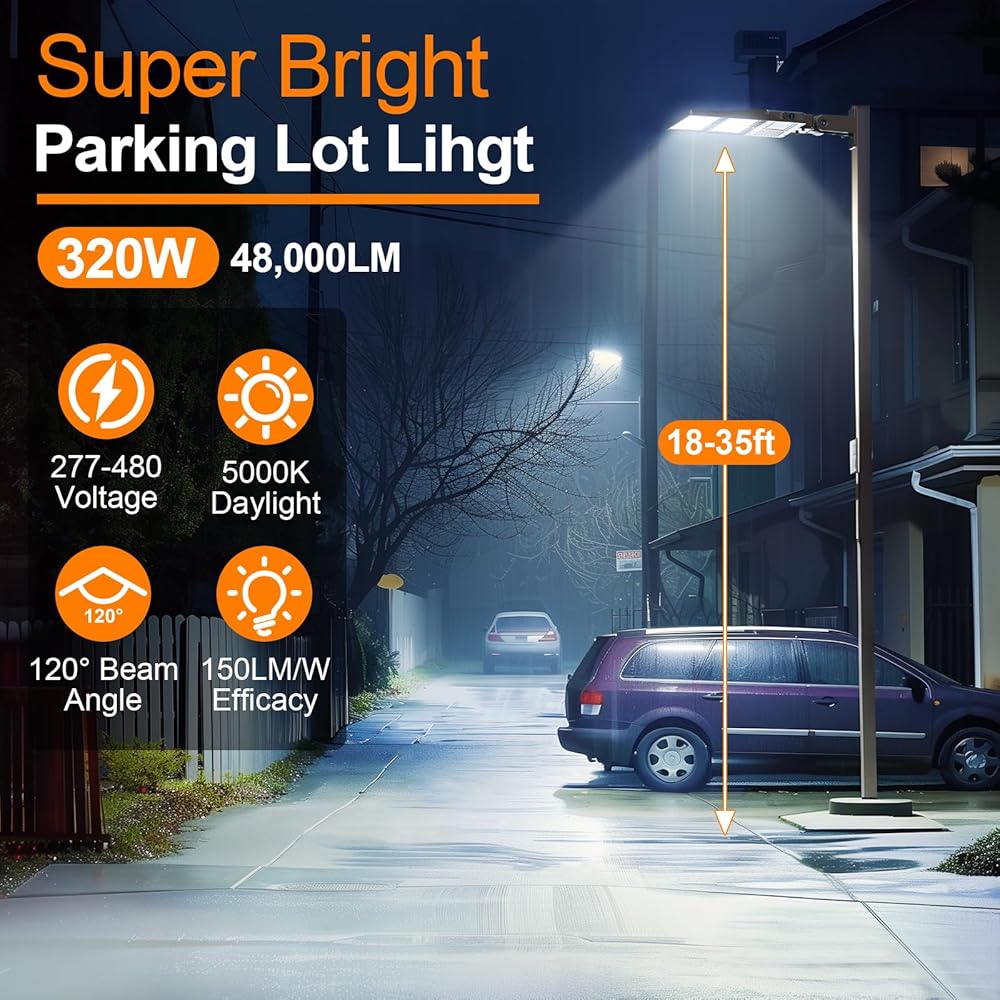 سطوع فائق والنوع الثالث: يتميز مصباح موقف السيارات LED بقدرة 320 وات بكفاءة عالية تبلغ 150LM/W، ويوفر 48000 لومن في ضوء النهار 5000K. مضاد للصدمات، بدون وهج، بدون ظلال، يحمي عينيك. يوفر توزيع النوع الثالث تغطية إضاءة أوسع