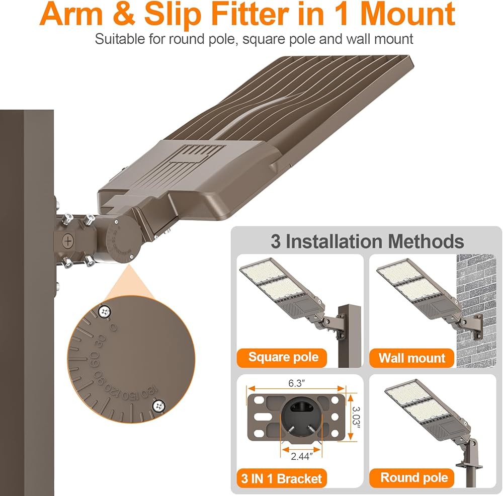 تركيب مناسب للذراع والانزلاق: تأتي مصابيح موقف السيارات مع حامل ذراع محدث ومثبت انزلاق في دعامة واحدة، يحتوي مصباح LED الخاص بموقف السيارات هذا على 3 طرق تركيب مناسبة للأعمدة الدائرية (يناسب لسان OD مقاس 2.36 بوصة)، والأعمدة المربعة، و يتصاعد الجدار