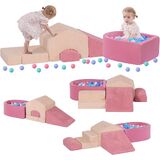 · مجموعة التسلق مع حفرة كروية: تستخدم هذه المجموعة رغوة سميكة 30D مع جلد سويدي ناعم، وتتميز بوحدة حفرة كروية بالإضافة إلى المنحدر المائل والدرج ووحدة على شكل منزل (الكرات غير متضمنة). تساعد الأطفال على تحسين عيونهم اليدوية التنسيق والتوازن، مع حرية إنشاء أشكال مختلفة لمزيد من المرح في اللعب!