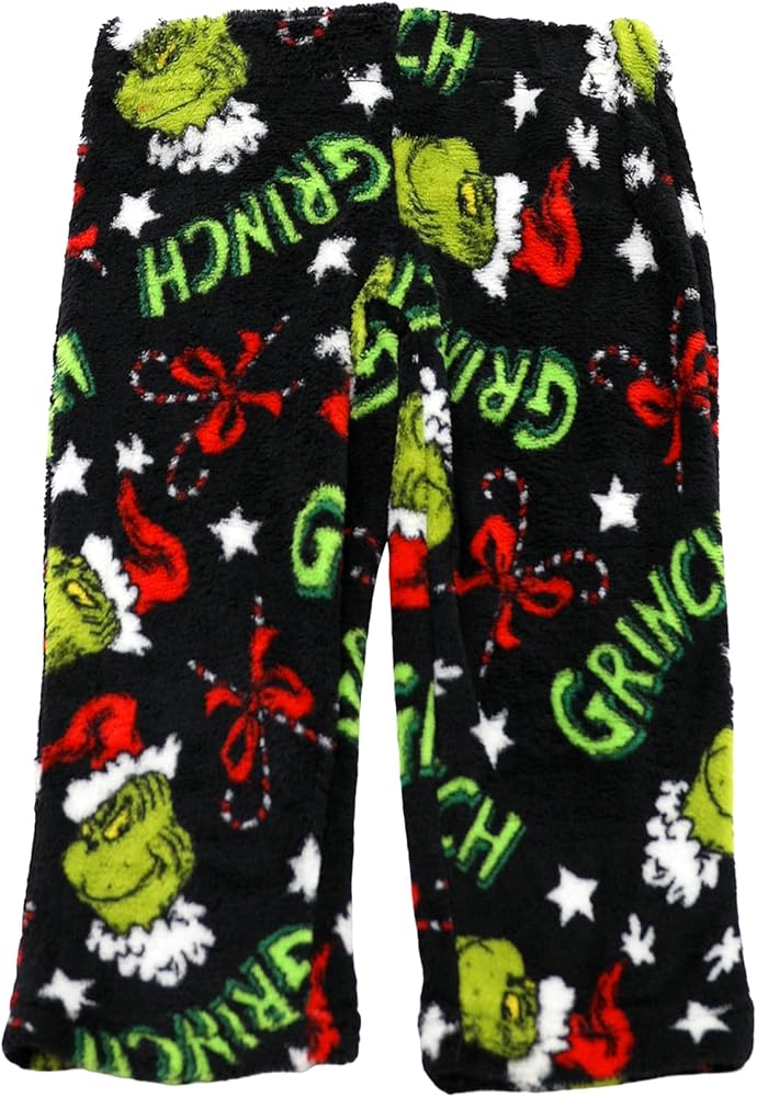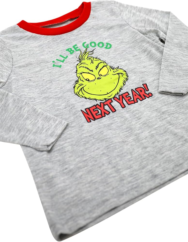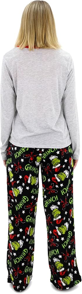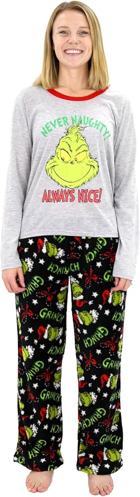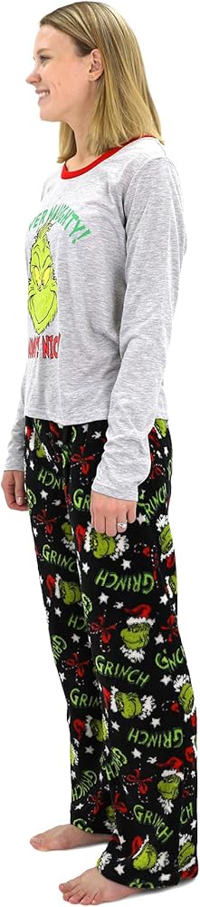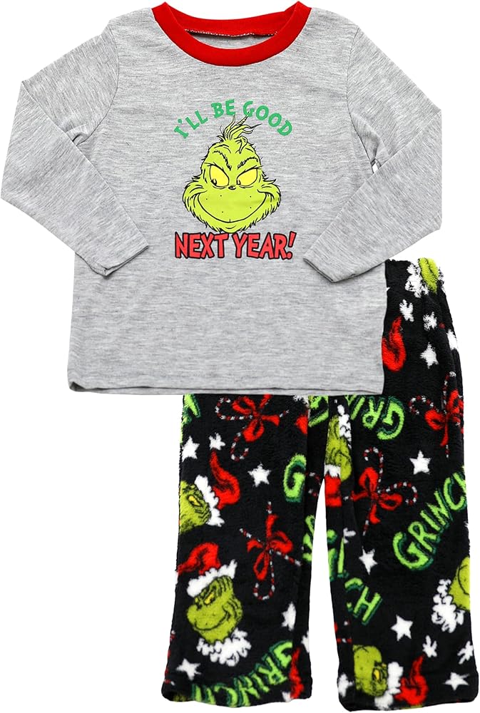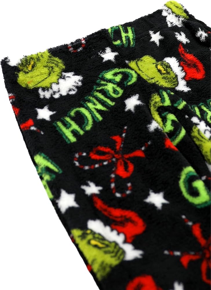 Festive Design: Adult and kids' sets feature a long sleeve top with the Grinch's face and 'Grinchmas' text, paired with plush pants in an all-over Grinch print