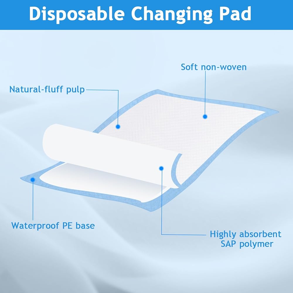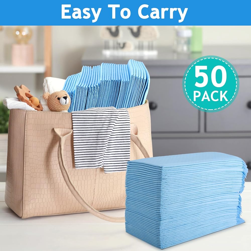 • وسادات تغيير الحفاضات للاستعمال مرة واحدة: سوف تحصل على 50 وسادة كبيرة الحجم للاستعمال مرة واحدة، تلبي الاحتياجات اليومية المختلفة للأطفال. تتميز وساداتنا بأنها خفيفة الوزن وتأتي في عبوة صغيرة بحيث يمكن وضعها بسهولة في حقيبة الحفاضات وحقائب اليد.
