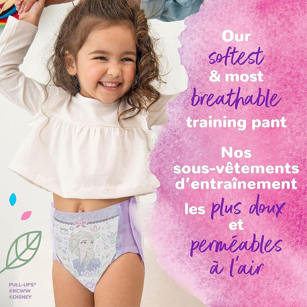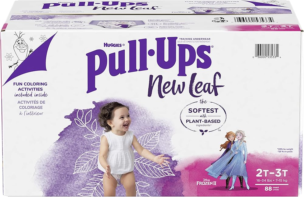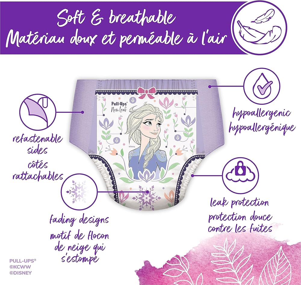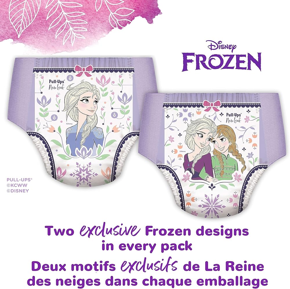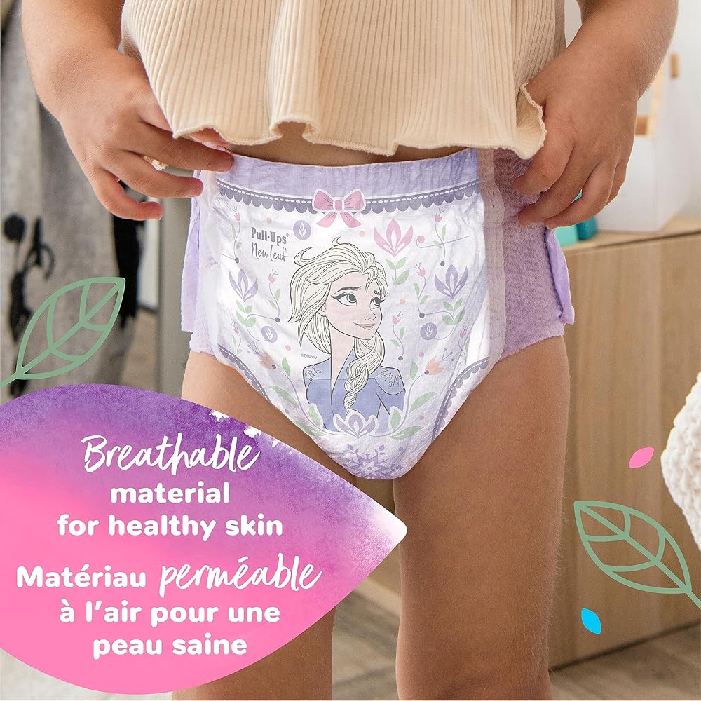 Softest training underwear crafted with plant-based ingredients* for healthy skin (*28% by weight) Clinically proven hypoallergenic training pants made without harsh ingredients Cottony-soft, gentle & breathable pant material with high absorbency and up to 12 hours of Pull-Ups' trusted leak protection Super soft, refastenable sides with an adjustable waistband that provides a comfy & secure fit and allows for easy changes on-the-go or at home Underwear like design that looks, feels, & fits like underwear with easy up & down motion to promote learning and Big Kid independence Exclusive graphics of Disney's Frozen II include a wetness indicator that fades when wet to help your child learn to potty train Coloring mat included featuring fun Frozen characters* (Colored pencils not included) Pull-Ups New Leaf Girls' Disney Frozen Potty Training Pants, 2T-3T, 88 Ct
