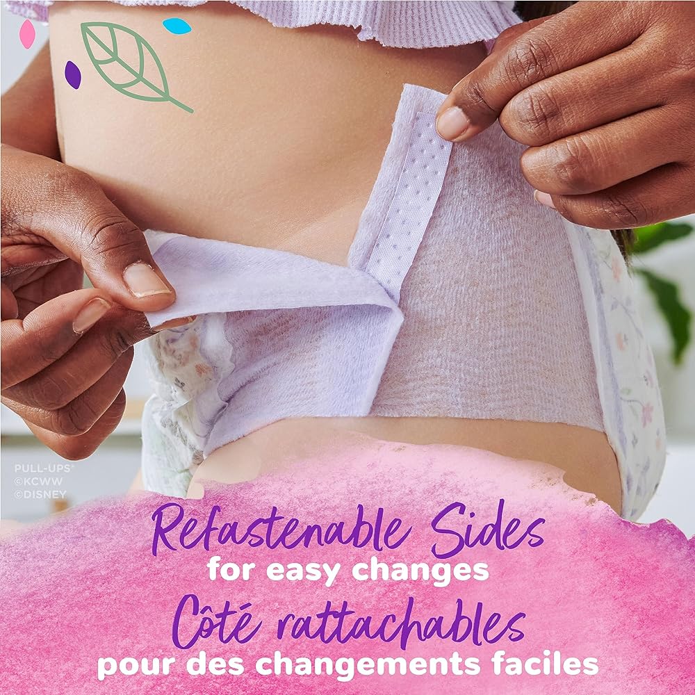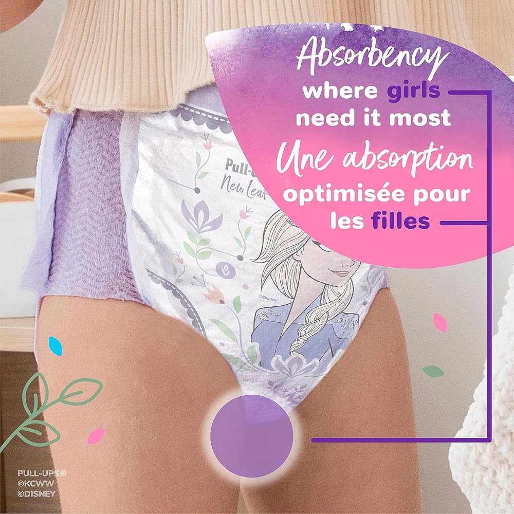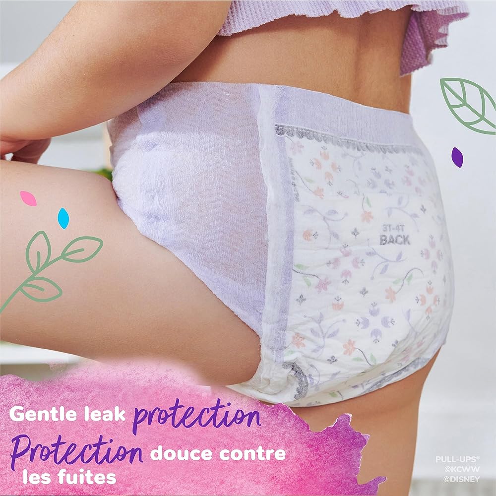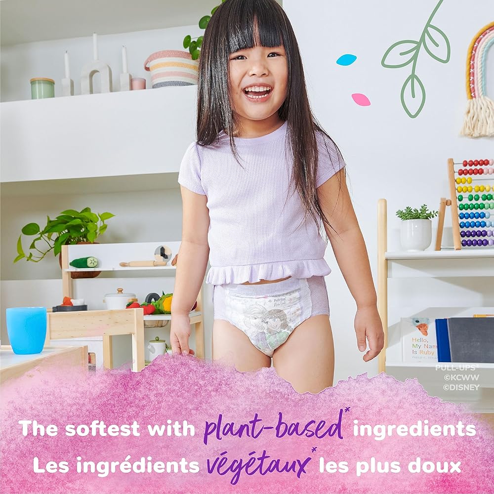 Softest training underwear crafted with plant-based ingredients* for healthy skin (*28% by weight) Clinically proven hypoallergenic training pants made without harsh ingredients Cottony-soft, gentle & breathable pant material with high absorbency and up to 12 hours of Pull-Ups' trusted leak protection Super soft, refastenable sides with an adjustable waistband that provides a comfy & secure fit and allows for easy changes on-the-go or at home Underwear like design that looks, feels, & fits like underwear with easy up & down motion to promote learning and Big Kid independence Exclusive graphics of Disney's Frozen II include a wetness indicator that fades when wet to help your child learn to potty train Coloring mat included featuring fun Frozen characters* (Colored pencils not included) Pull-Ups New Leaf Girls' Disney Frozen Potty Training Pants, 2T-3T, 88 Ct
