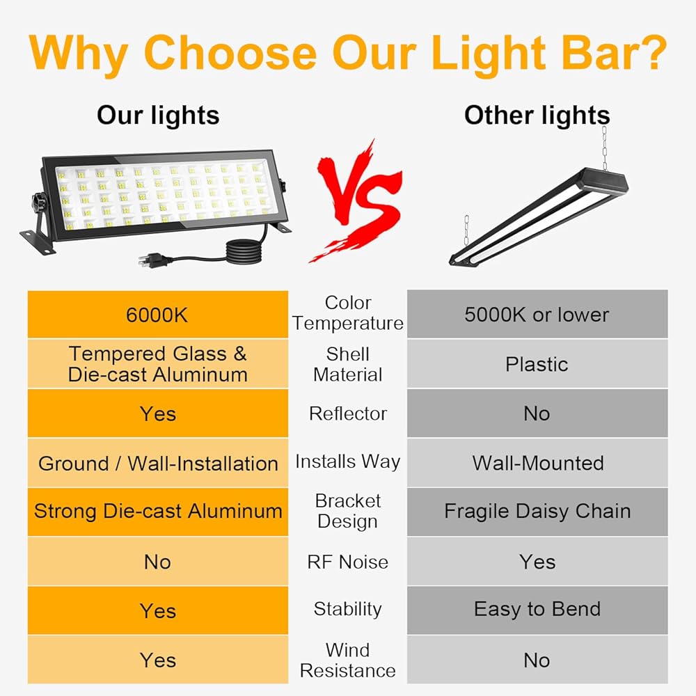 【ادمج 2 في 1】يمكن دمج اثنين من مصابيح المتجر المنفصلة بقدرة 120 وات مع دعامة تثبيت على شكل حرف U لإجمالي 240 وات، والتي يمكن أن تضيء مساحة أكبر. يمكنك تغيير الزاوية وضبط منطقة الإضاءة حسب تفضيلاتك، ويمكن أن يصل الحد الأقصى للسطوع إلى 20,000 لومن.