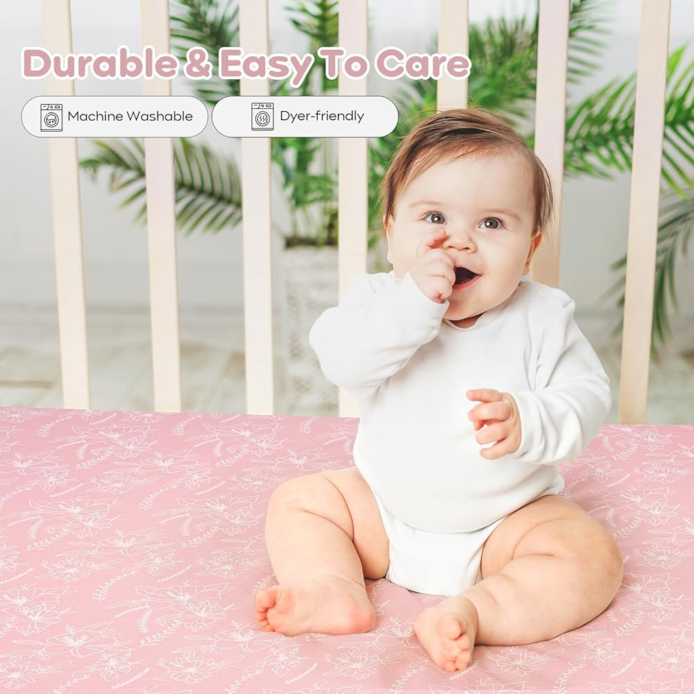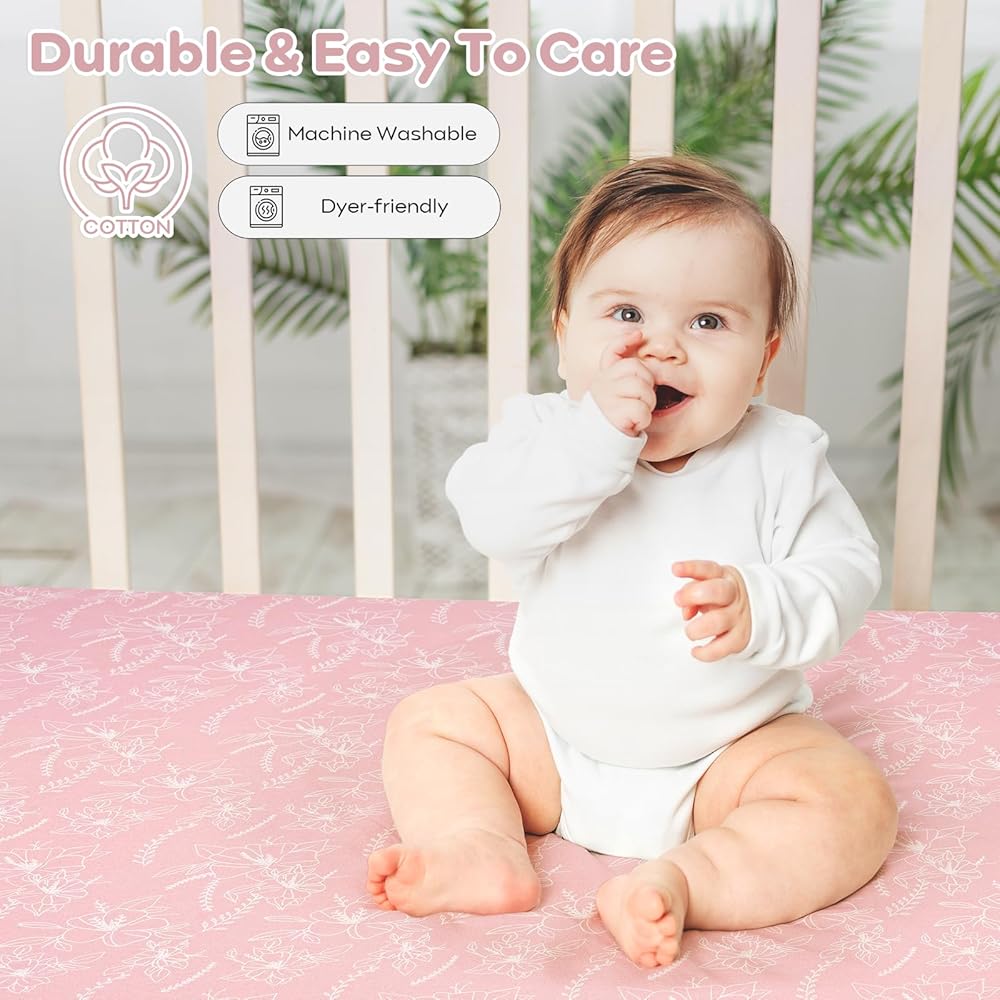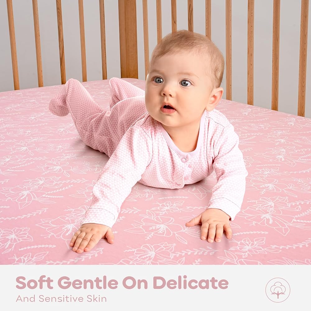 فائقة النعومة: ملاءات سرير الأطفال الخاصة بنا مصنوعة من القطن بنسبة 100% مع أقصى قدر من التهوية ومغزولة لتوفير لمسة ناعمة ولطيفة، ولا تسبب ملاءات سرير الأطفال الملائمة لدينا تهيج بشرة الطفل الحساسة. تسمح الألياف الطبيعية بتدفق هواء ممتاز، مما يحافظ على نوم طفلك مريحًا طوال الليل.