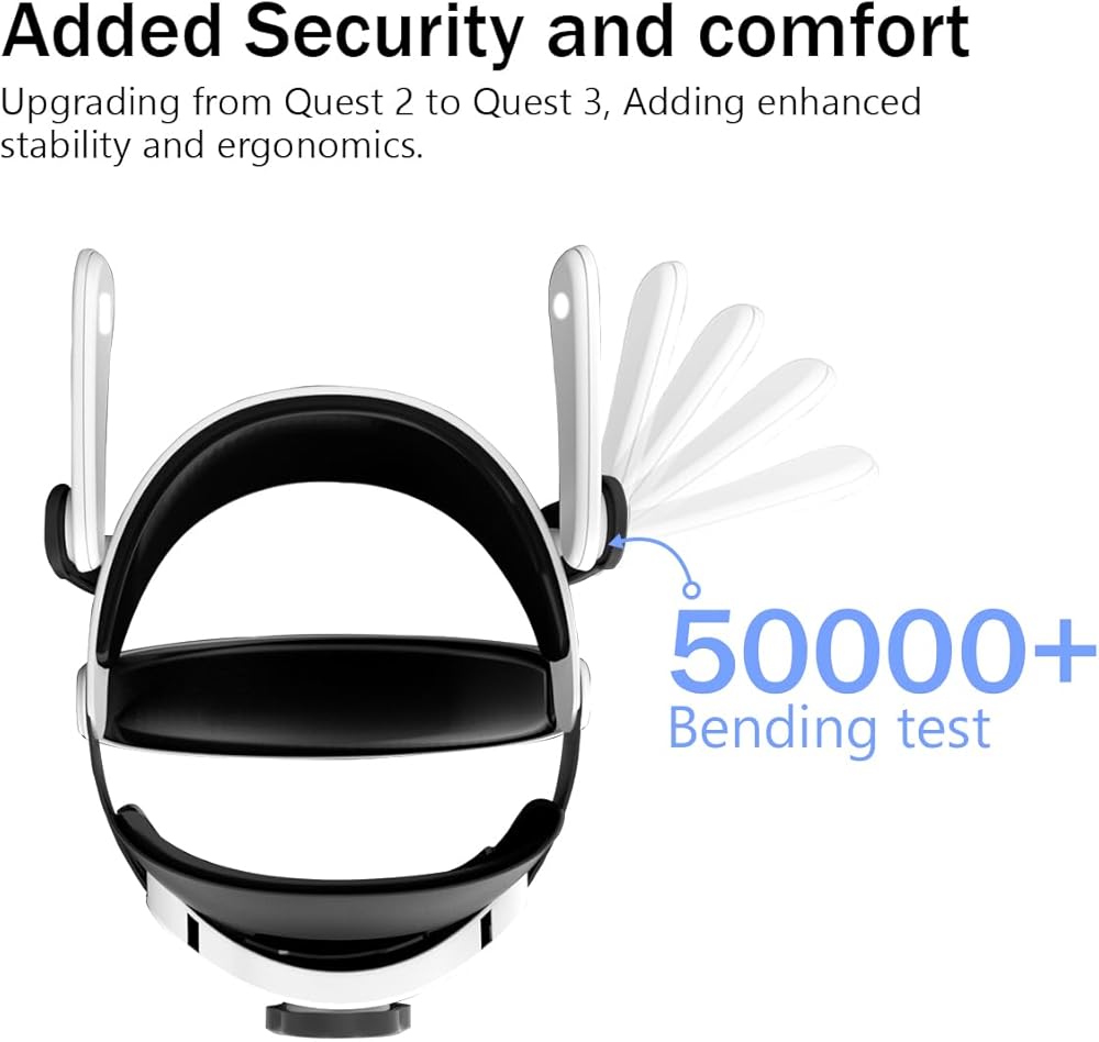 حزام Oculus Quest 3S & Quest 3 Sturdy Elite: يمكنه حمل سماعة الرأس بقوة أكبر عند لعب ألعاب الواقع الافتراضي مثل Beat Saber/Hot Squat/BoxVR/Holopoint بسبب المقبض القابل للتعديل الموجود في الخلف. يتحمل أكثر من 50000 انحناء دون أن ينكسر، مما يضيف الأمان والمتانة
