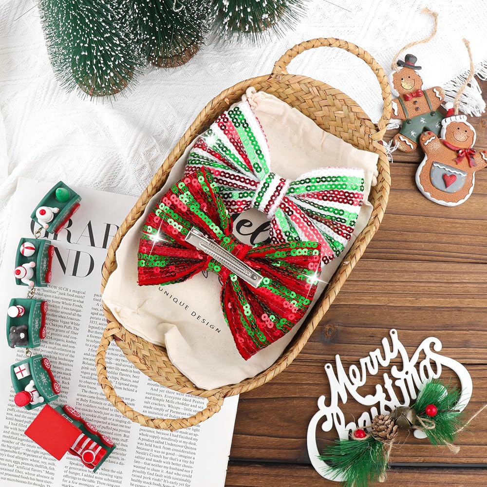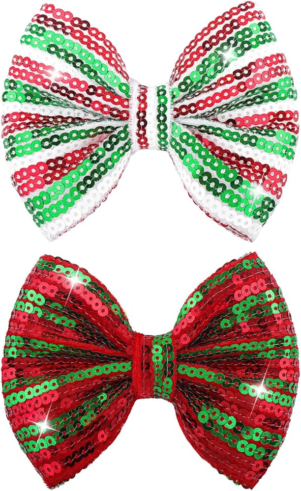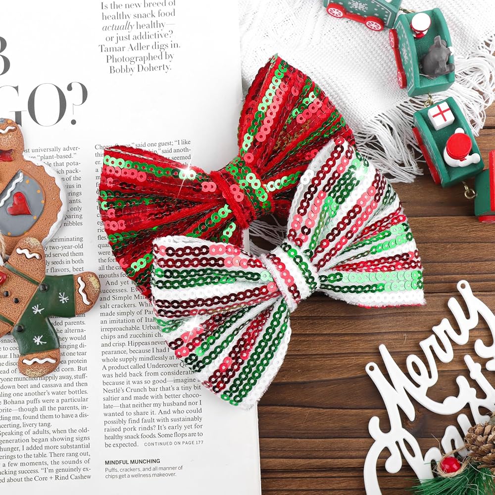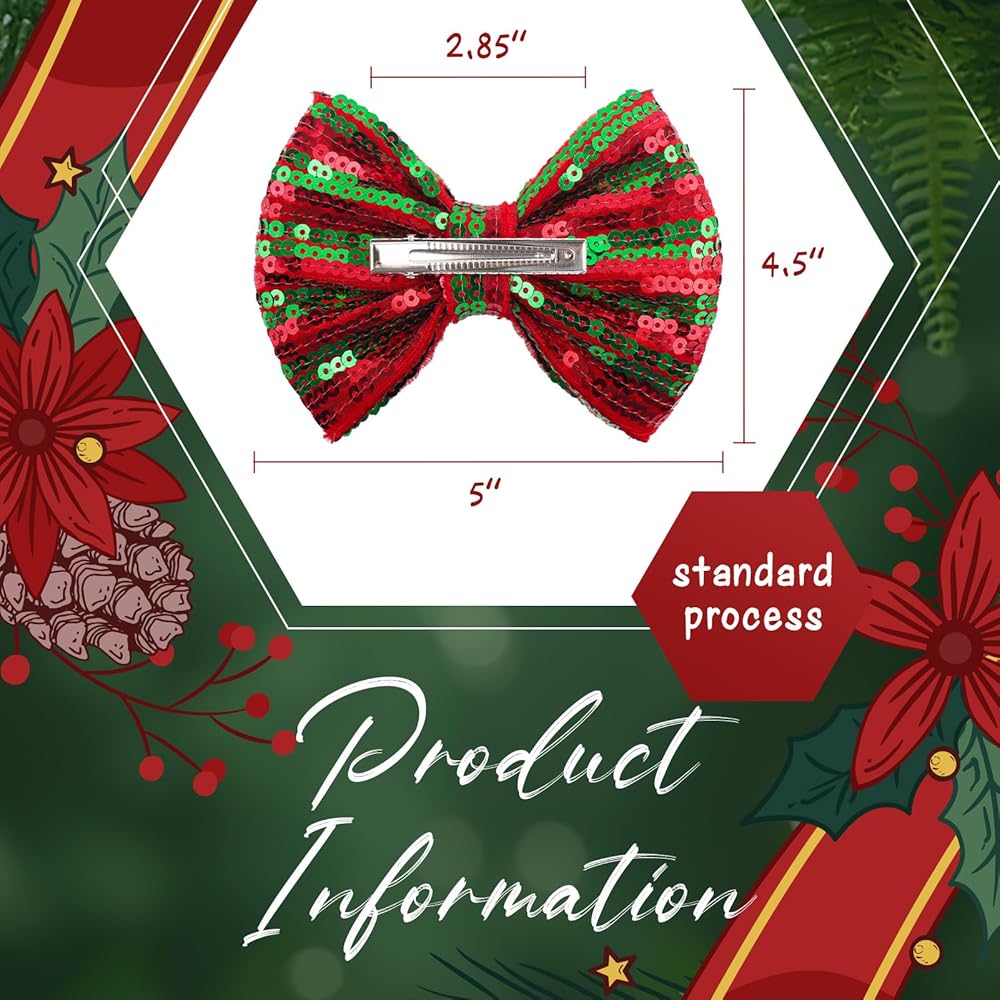 • مشابك شعر ترتر عيد الميلاد: تصميم عصري جديد جميل مع إكسسوارات فيونكة لامعة من قماش الترتر مقاس 5 بوصات مع عقد فراشة للفتيات الكبيرات في حفلة عيد الميلاد.