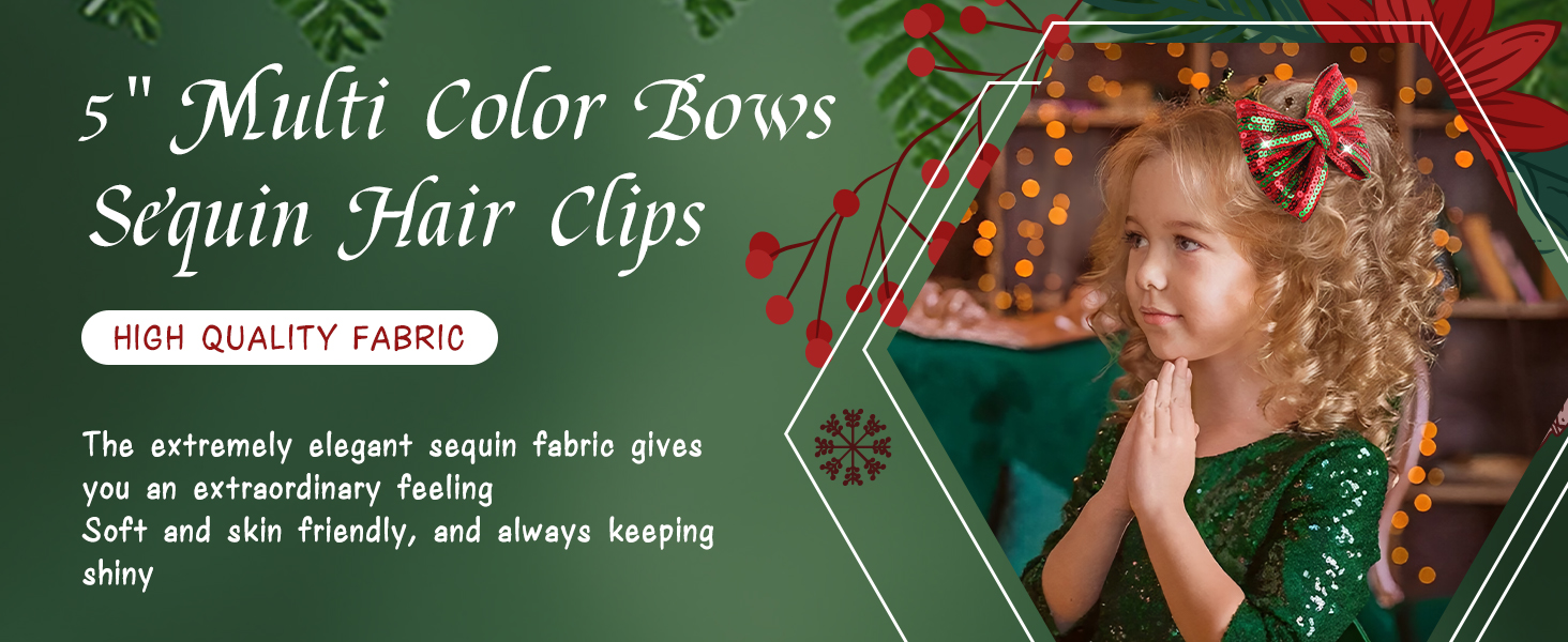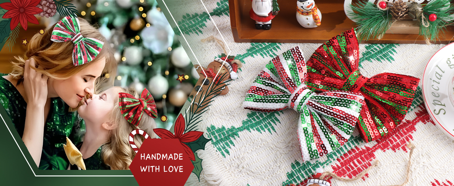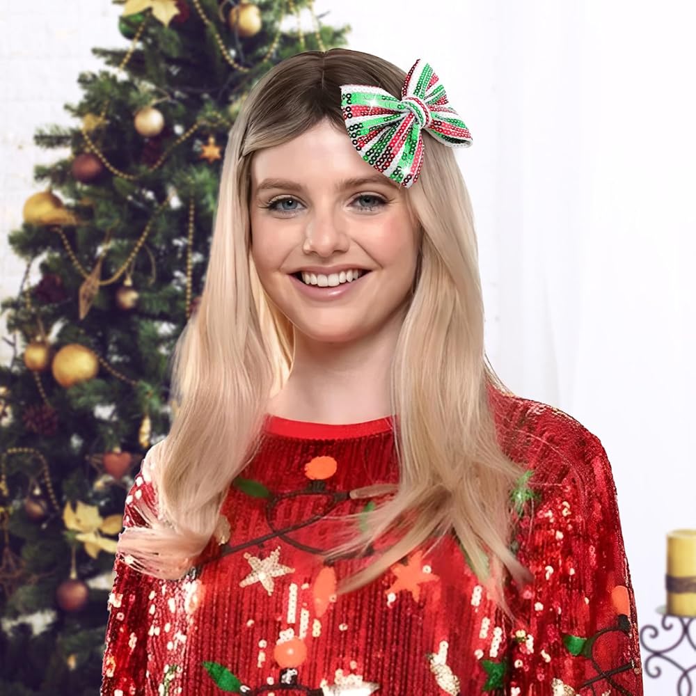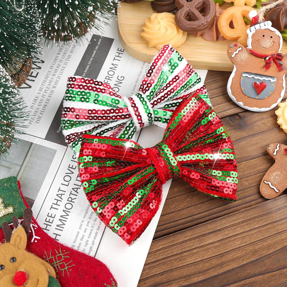 • مشابك شعر ترتر عيد الميلاد: تصميم عصري جديد جميل مع إكسسوارات فيونكة لامعة من قماش الترتر مقاس 5 بوصات مع عقد فراشة للفتيات الكبيرات في حفلة عيد الميلاد.