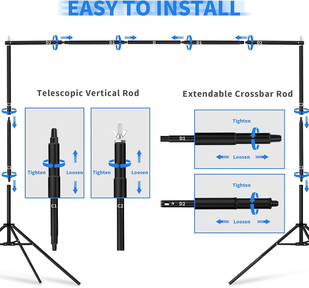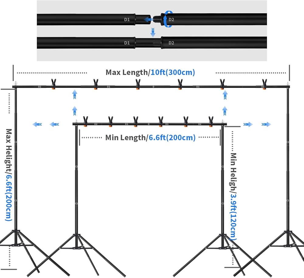 سهل التجميع: يتميز حامل الخلفية بقفل خيط مدمج لسهولة التركيب والاتصال الصلب. يمكن تلسكوب العارضة والقضبان الرأسية لحامل الخلفية وتعديل الارتفاع والطول وفقًا لاحتياجاتك