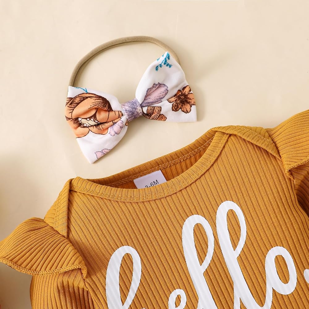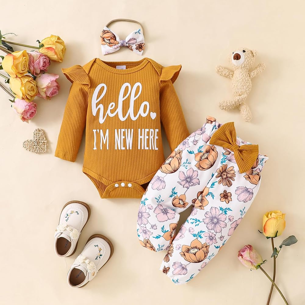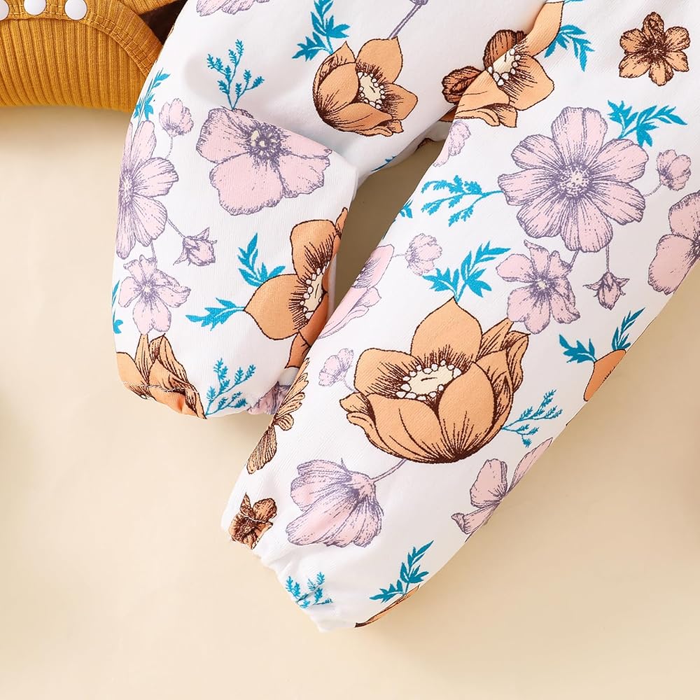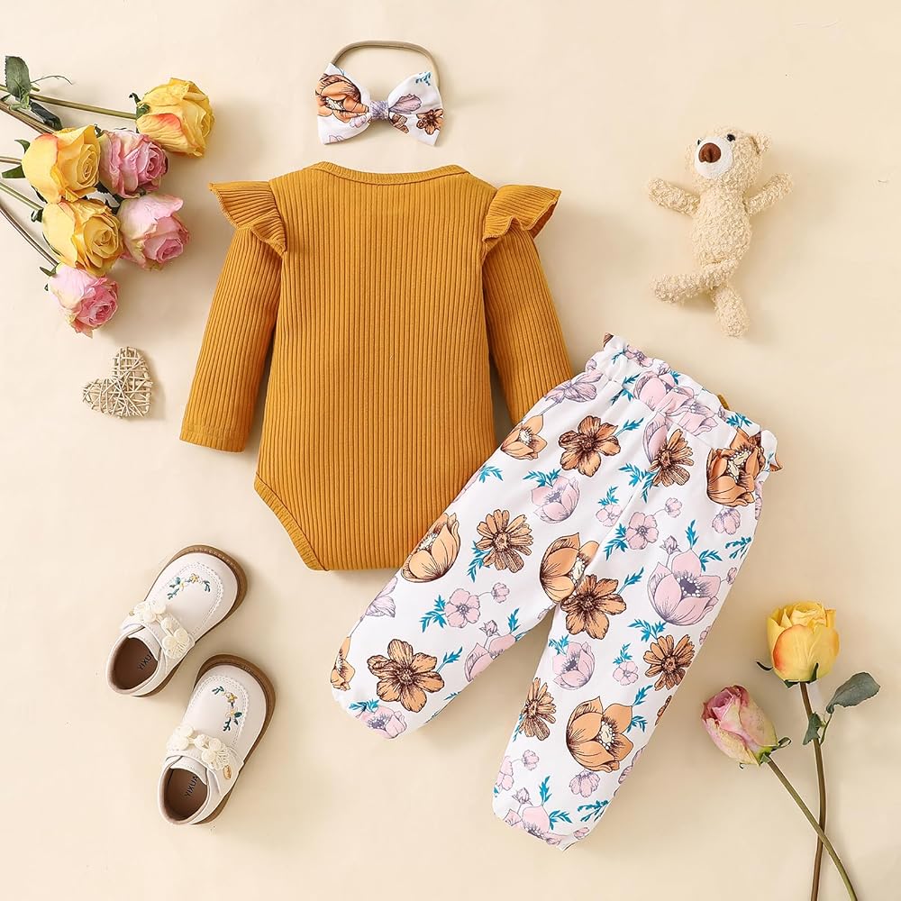 مجموعة ملابس الخريف والشتاء للفتيات الصغيرات: قطعة واحدة من ملابس علوية مكشكشة، قطعة واحدة من السراويل الطويلة المزينة بالزهور، قطعة واحدة من عصابات الرأس