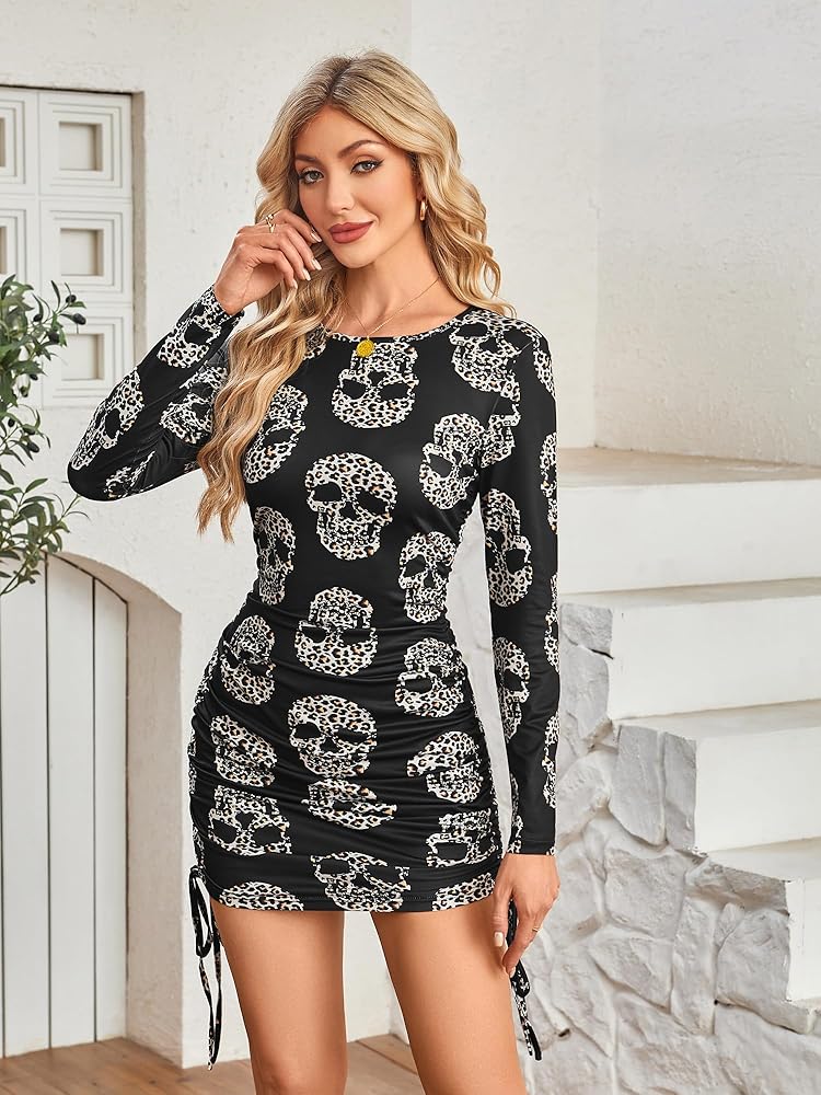 المزايا: رقبة دائرية، فستان مطبوع عليه الهالوين، رباط جانبي، فستان ضيق بأكمام طويلة مكشكش. فستان مطبوع قوطي. فستان قصير مثير.