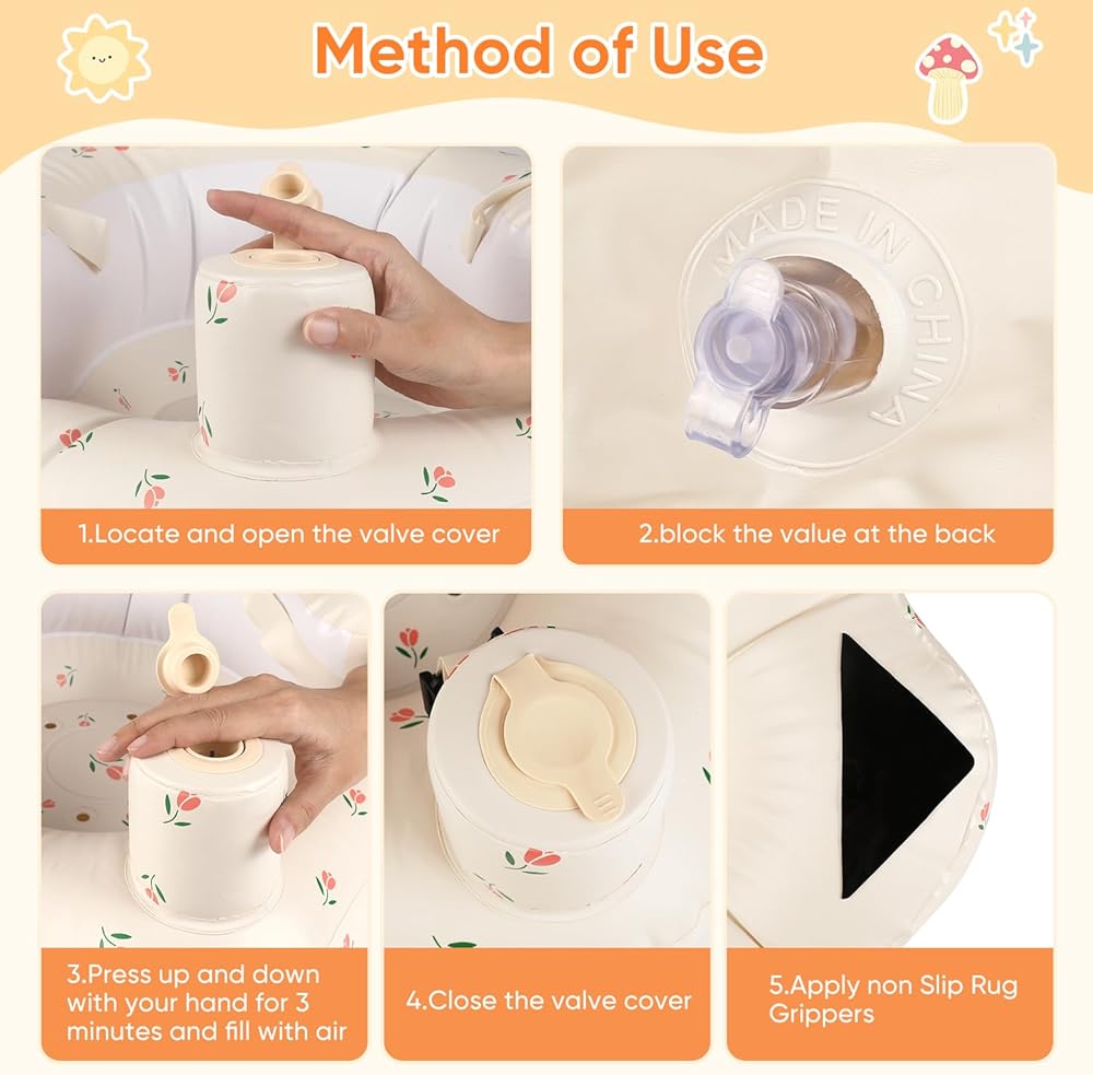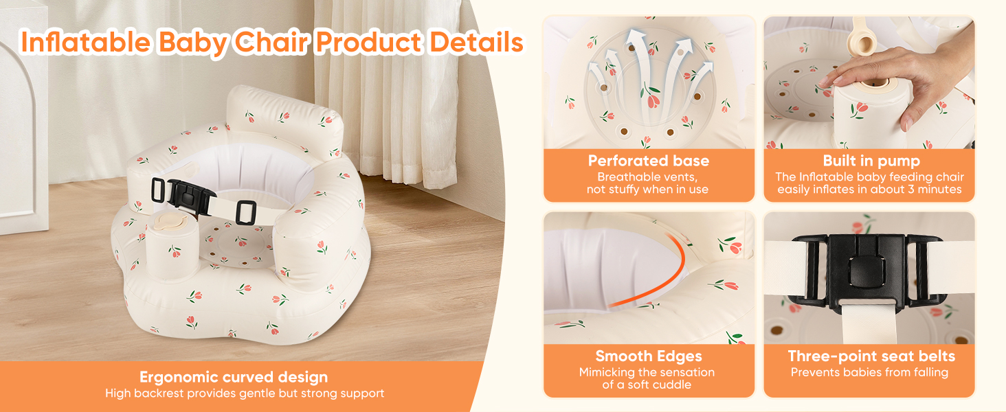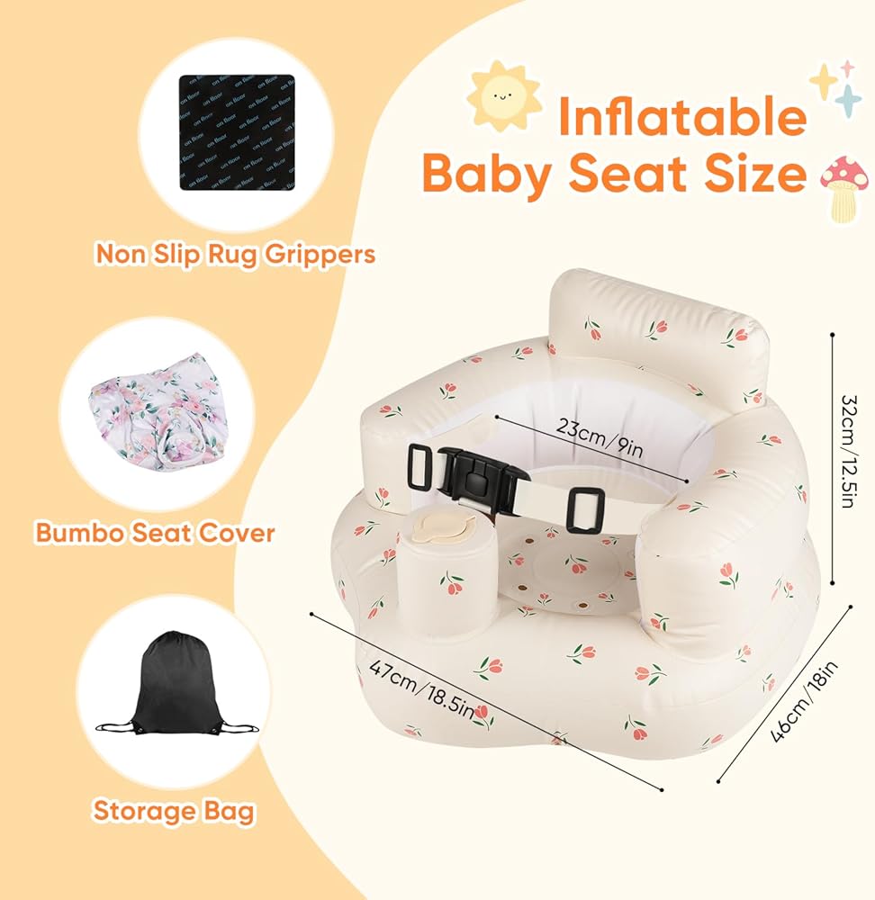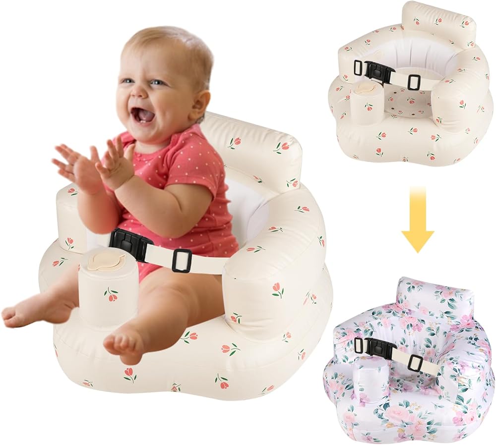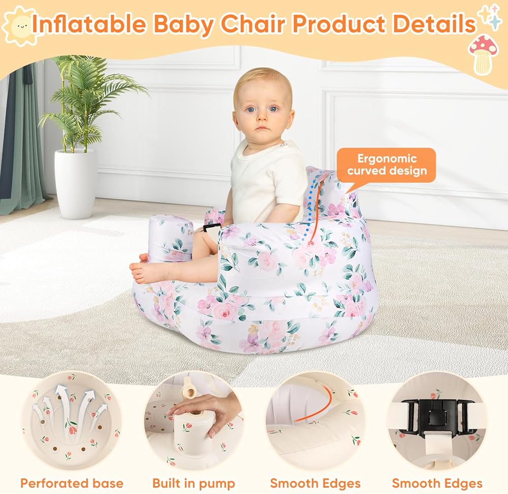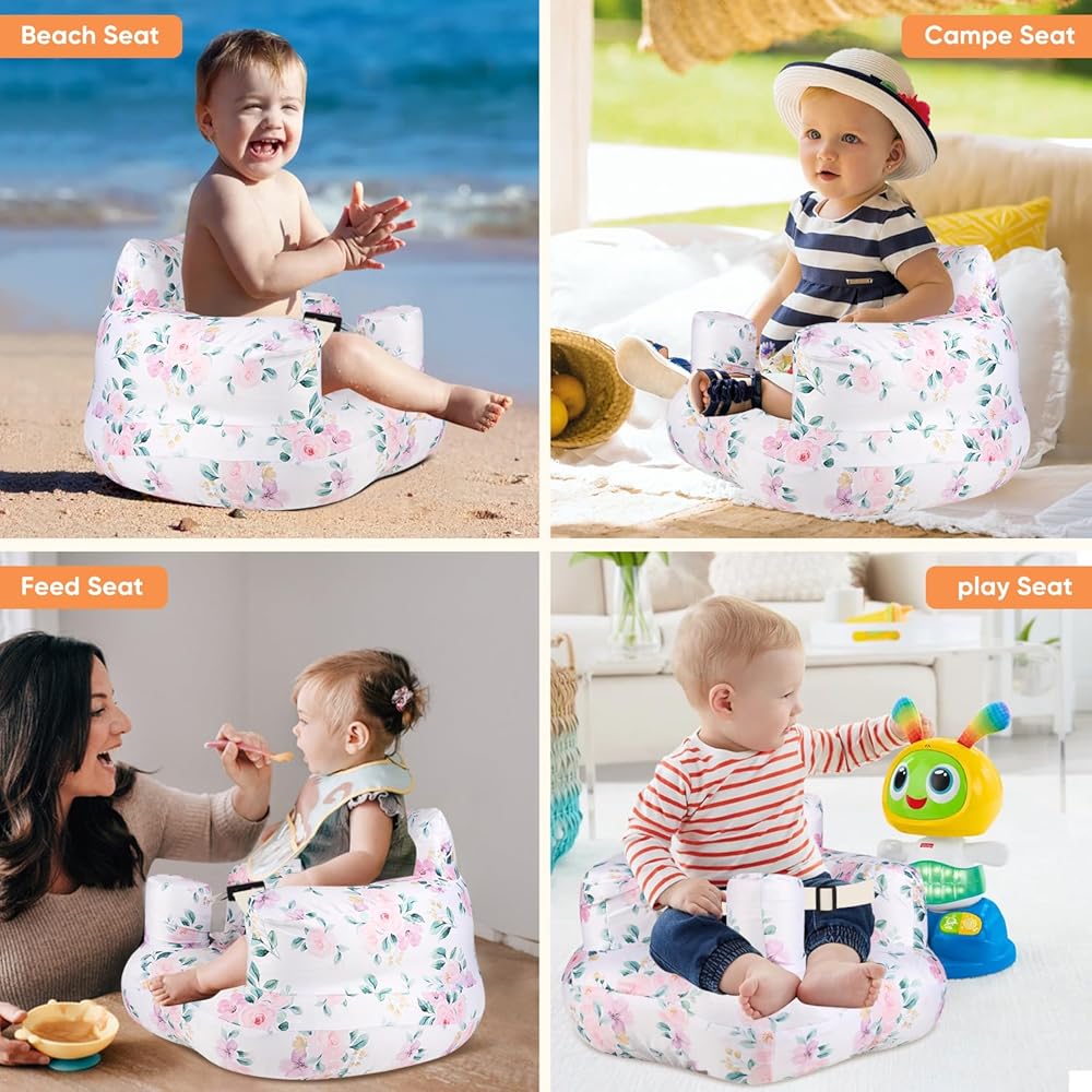 مقعد أطفال قابل للنفخ للرضع من عمر 3 إلى 24 شهرًا فما فوق، مقعد كرسي أطفال قابل للنفخ مع مضخة هواء مدمجة، حزام أمان ثلاثي النقاط، مقعد أطفال قابل للنفخ مناسب للأرضيات المنزلية والمروج والشواطئ والمزيد