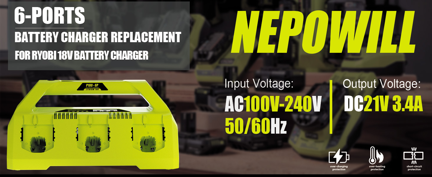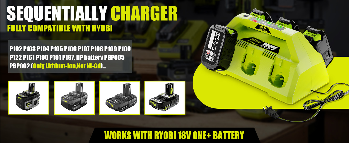 طاقة لبطارية RYOBI 18 فولت - شاحن سريع لبطارية Ryobi 18 فولت، متوافق بنسبة 100% مع بطارية Ryobi 18 فولت P102 P104 P105 P106 P108 P107 P109 إلخ. استبدال شاحن بطارية وحدة 6 في 1 لشاحن Ryobi السريع 18 فولت، بطاريات شحن سريع واستخدام فقط 1 منفذ. تعزيز سرعة الشحن، وتقليل وقت انتظار الشحن.
