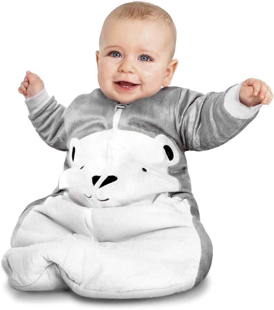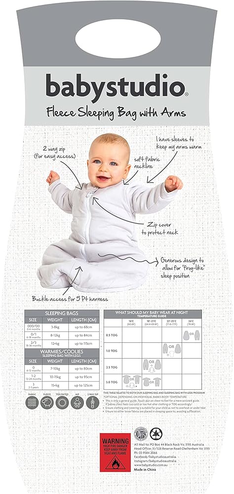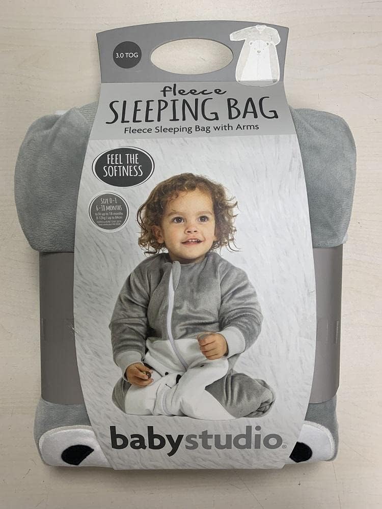 Sleeping bag with arms - Polar bear Koala bear - 3.0 TOG cotton/fleece DESCRIPTION BACK BY POPULAR DEMAND....OUR ADORABLE FLEECE SLEEPING BAGS All kiddies love dressing up and pretending to be their favorite animal. Now they can be dress nice and snuggly warm and pretend to be a Koala or Polar Bear. Sleeping made safe yet stylish and fun. Babystudio sleeping bags and babystudio warmies have been designed as a safe sleep alternative for the child who kicks their blankets off during sleep time. Our range of sleeping bags and warmies help avoid our littlies being wrapped up in the excess material while keeping them snug and warm during their sleeping time. babystudio: providing safe sleeping alternatives to solve those sleeping dilemmas. SPECIFICATIONS babystudio sleeping bag size suggestion (as a guide) Newborn to 6 months Length of bag approx 68cm for a child up to 78cm Width of bag approx 28cm across the chest Item weight = 0.4Kg 6 months to 18 months Length of bag approx 78cm for a child up to 88cm Width of bag approx 32cm across the chest Item weight = 0.4Kg 18 months to 36 months Length of bag approx 88cm for a child up to 98cm Width of bag approx 32cm across the chest Item weight = 0.4Kg RELATED INFORMATION *Sleeping temperature of the child will vary and therefore we recommend you dress your baby accordingly * Maternal Health Experts recommend sleeping bags as a safe alternative for keeping babies and toddlers warm at night. The sleeping bag and a fitted sheet should be the only items pl