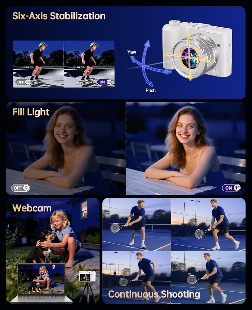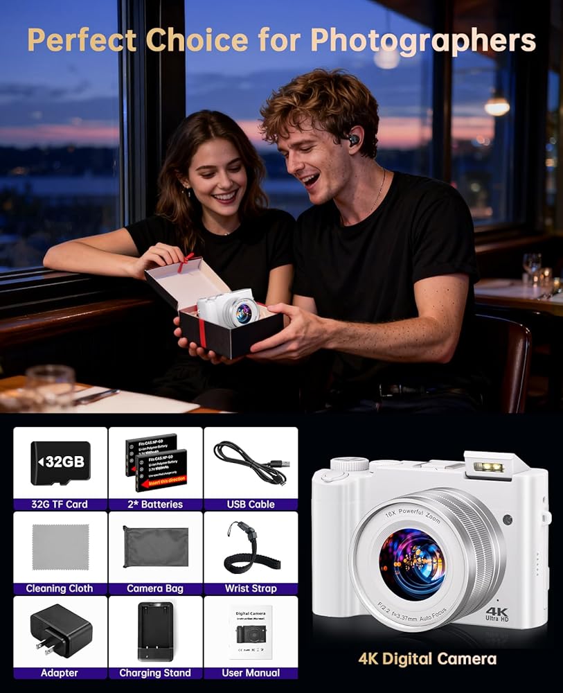 كاميرا رقمية بدقة 4K للتصوير الفوتوغرافي - كاميرا تسجيل فيديو بتركيز تلقائي بدقة 64 ميجابكسل لليوتيوب مع عدسة مزدوجة - تكبير رقمي 16X مضاد للاهتزاز 3 بوصة كاميرا سيلفي مدمجة مع فلاش، بطاريتان، حامل شحن أبيض