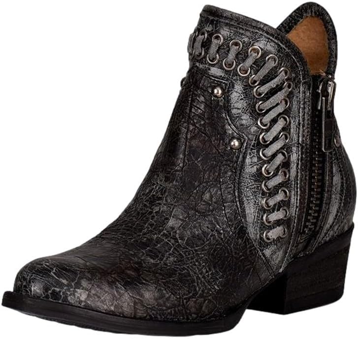 Amp up your style and enhance your personality with Corral Boots. Upper material: leather.Lining material: leather.Sole material: rubber.Insole material: leather. Comfy round toe. Side zipper for easy on and off. Leather boot accented with lace details at the top. Durable and stylish distressed block heel boots. Imported.