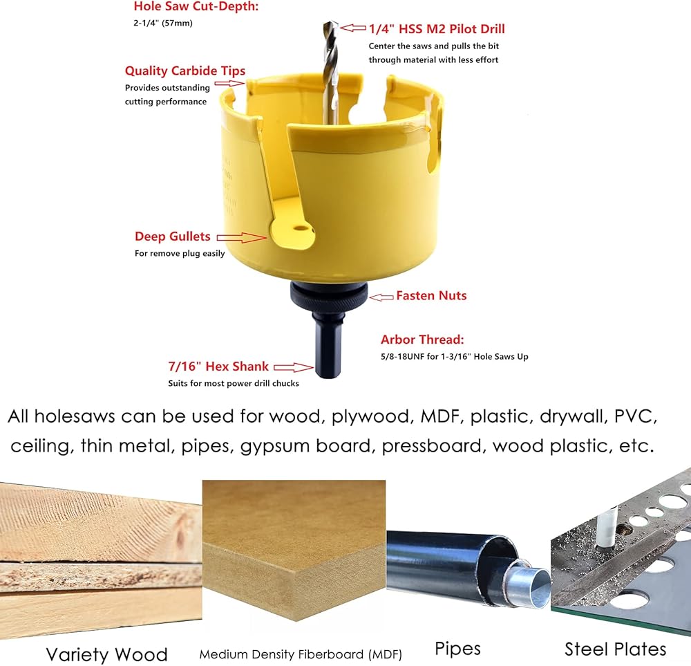 • MaxTool Carbide Tipped Holesaws are the best for drilling in asphalt, brick, concrete, dry wall, gypsum, Limestone, marble, MDF, tile, wood, composite, plastic, etc; Carbide Tip Pilot Drill bit is required for cutting some materials
