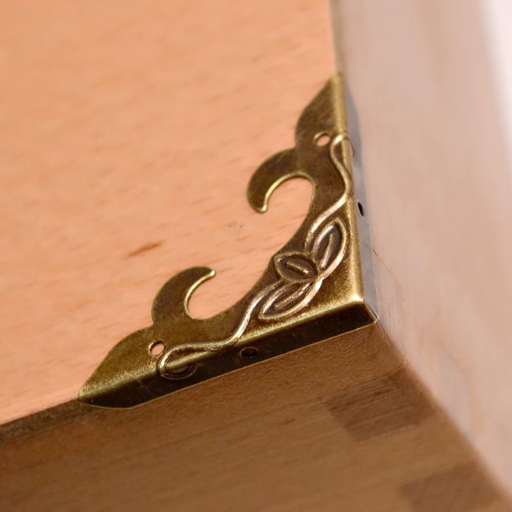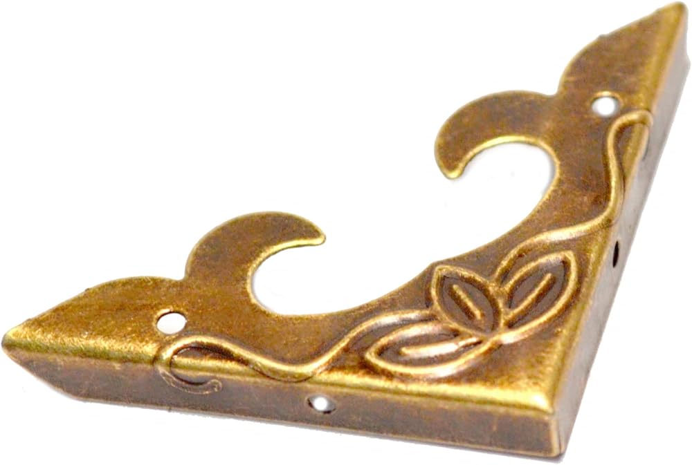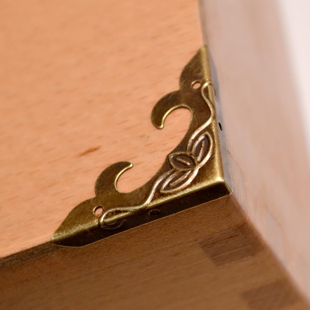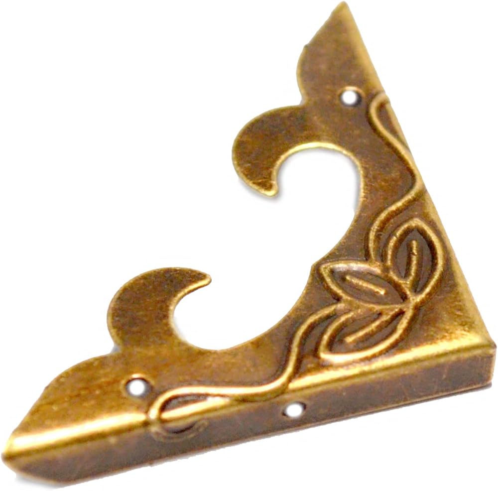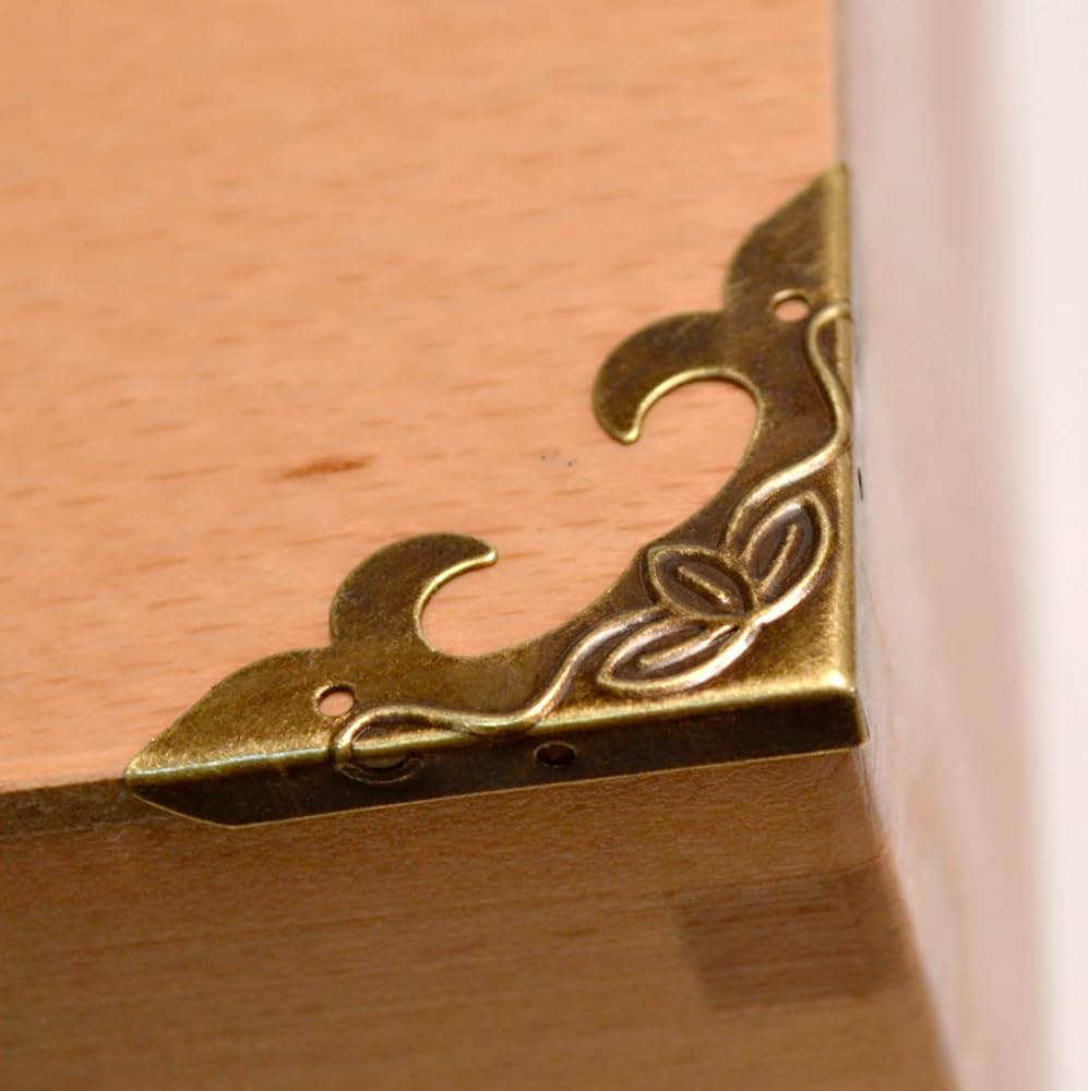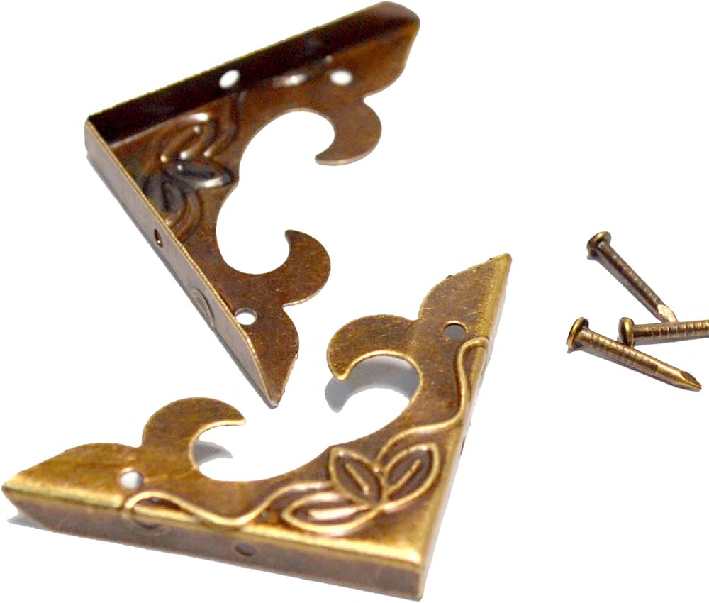 20 قطعة من واقيات الزوايا البرونزية العتيقة، أغطية حافة معدنية مزخرفة، واقيات أمان عتيقة، دعامة زاوية يمين قديمة مع مسامير لحافة الأثاث، صندوق مجوهرات زاوية خشبي (طول الجانب: 1-1/4 بوصة)