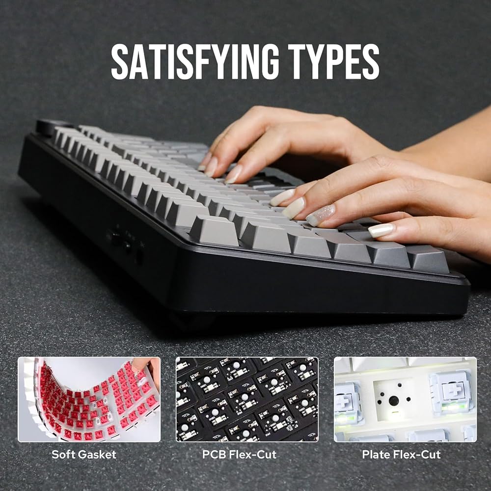 هيكل الحشية وخمس طبقات من مواد تحسين الصوت: تعتمد لوحة المفاتيح الميكانيكية F99 PRO على هيكل حشية، ووسادة سيليكون مدمجة ممتدة، وقطع PCB مرن لتحسين المرونة والثبات، مما يوفر تجربة كتابة أكثر نعومة ومرونة. مجهزة بـ 5 طبقات من المواد المخففة للصوت، فهي تعزز التأثير الصوتي للكتابة. مزيج من رغوة الساندويتش، ولوحة مفاتيح IXPE، وطبقة تحسين الصوت PET، والإسفنج السفلي، ووسادة غلاف السيليكون تساعد على القضاء على الصدى وتوفر صوت كتابة مستقر ومريح.