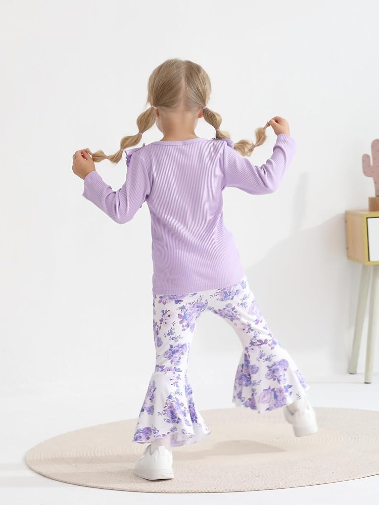 - التصميم: مجموعة ملابس للفتيات الصغيرات، قمصان كاجوال بأكمام طويلة بألوان ثابتة، سراويل واسعة مع طباعة زهور.