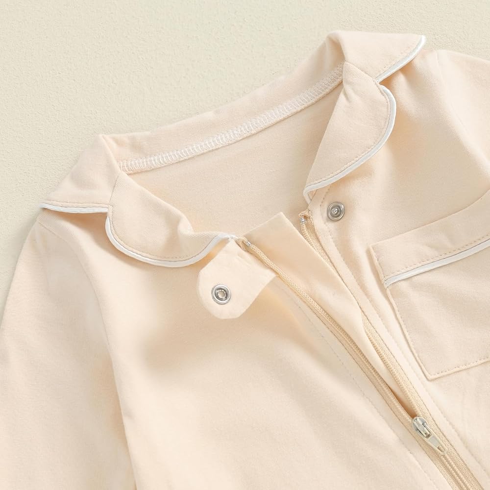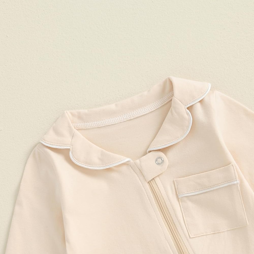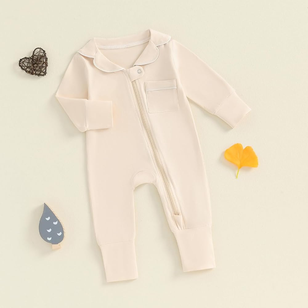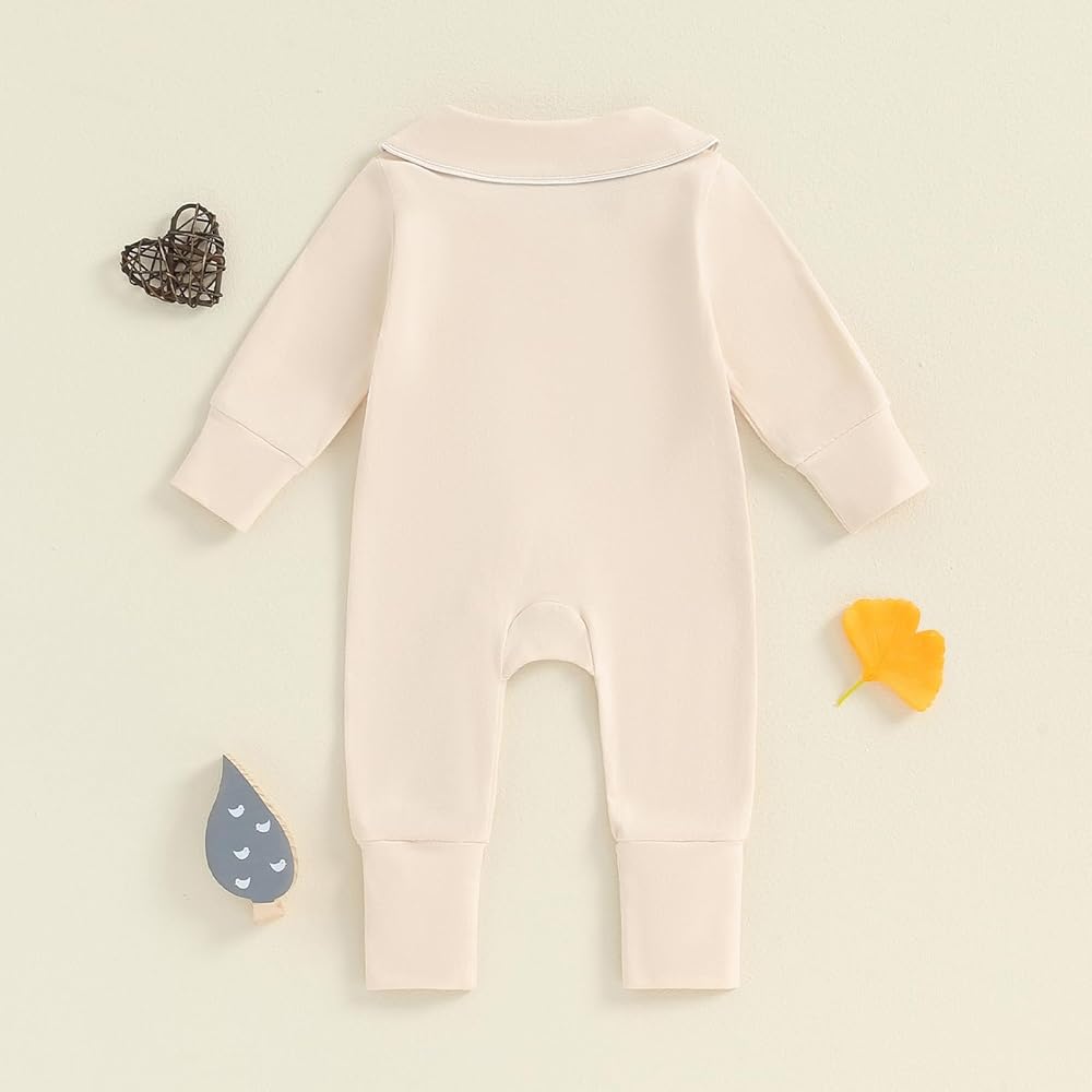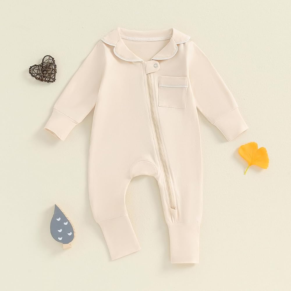 Infant Baby Boy Girl Romper Solid Color Lapel Neck Long Sleeves Zipper Front Full Length Jumpsuit