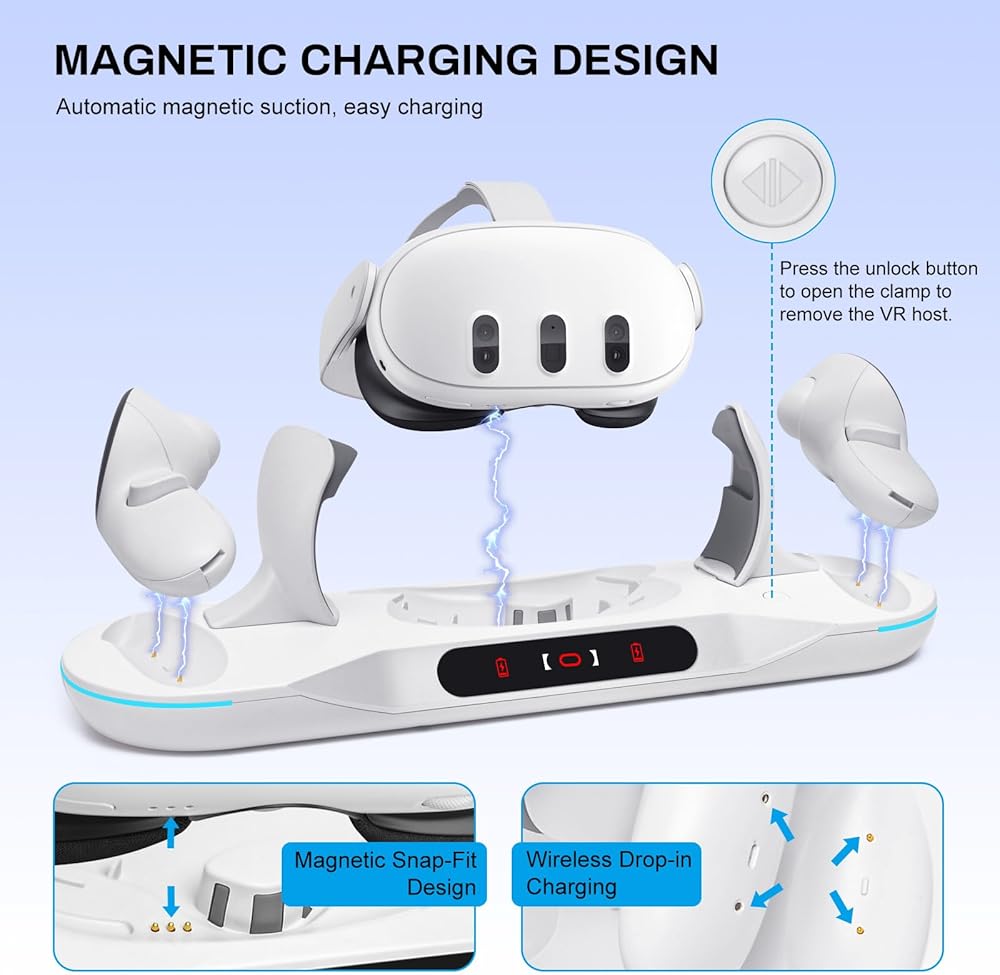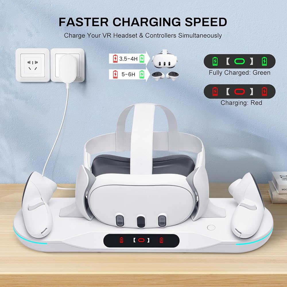 【Fast Charging Dock for Quest 2】 This magnetic rechargeable charging dock is meticulously designed for elite gamers. This charging station for Quest 2 has the remarkable ability to charge your headset and 2 touch controllers simultaneously, thereby saving both your time and conserving your batteries. It offers fast and safe charging, fully recharging your headset and touch controllers within 3 - 4 hours.