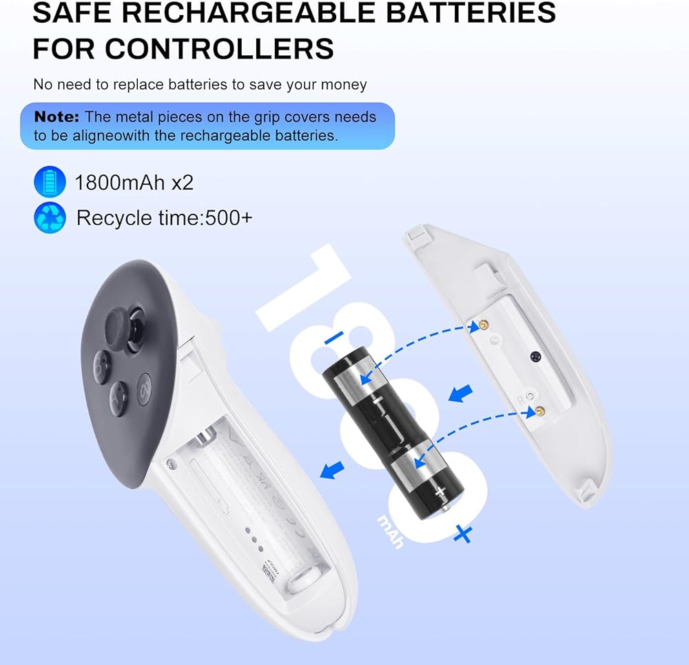 【2 Rechargeable Batteries & Cover】 The included 2 x 1800 mAh rechargeable batteries and custom covers for the Quest 2 controller spare you from the tiresome task of endless battery replacement. It is crucial to ensure that the "+" and "-" of the battery align precisely with the "+" and "-" of the handle, and that the aluminum sheet of the battery is flush with the aluminum sheet on the battery cover of the handle; otherwise, the handle will not be able to charge.