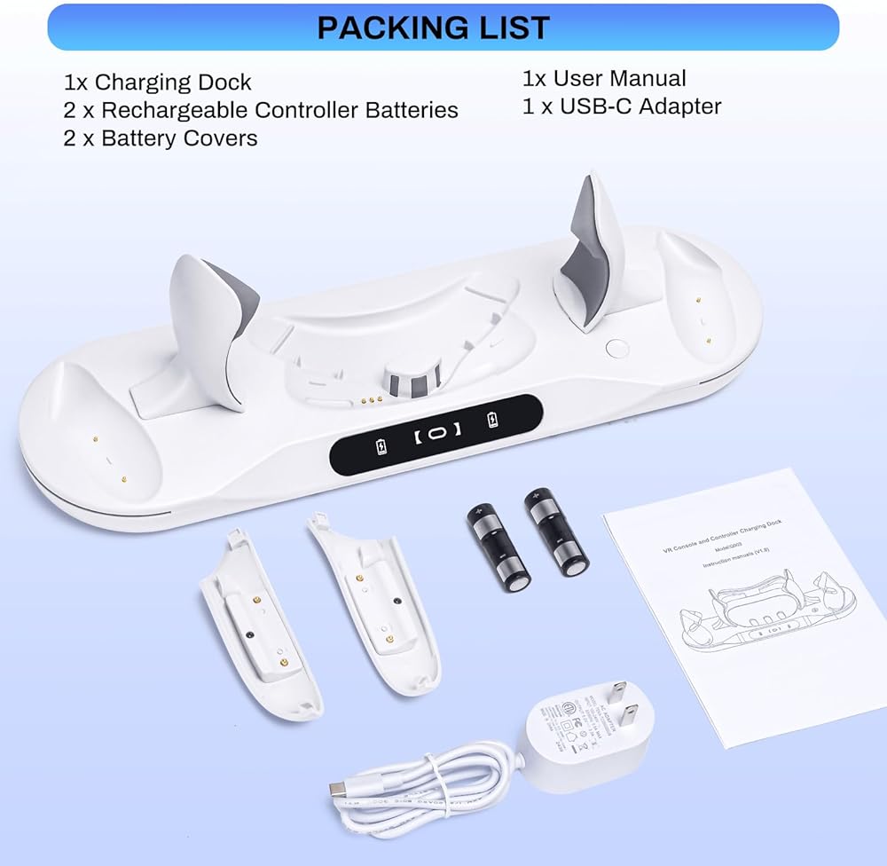 【What You Get】 Our kit encompasses everything you need to elevate your Quest 2 gaming experience. The package includes: 1 x Charging Dock, 1 x Adapter, 1 x USB C Cable, 2 x Magnetic USB-C Connector, 2 x Rechargeable Controller Batteries, 2 x Battery Covers, 1 x User Manual. Please do not hesitate to contact us if you have any questions.