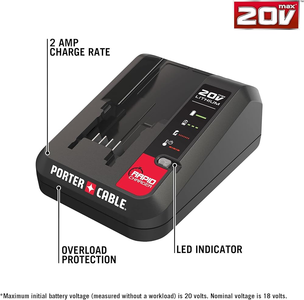 This 20V MAX* Battery Charger charges all PORTER-CABLE 20V MAX* batteries. PORTER-CABLE 20V lithium battery features a fast 2-amp charge rate with overload protection that protects from damaging cells. An LED indicator shows battery status and remaining charge capacity.