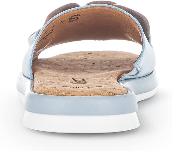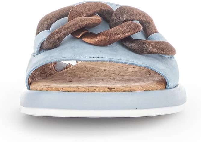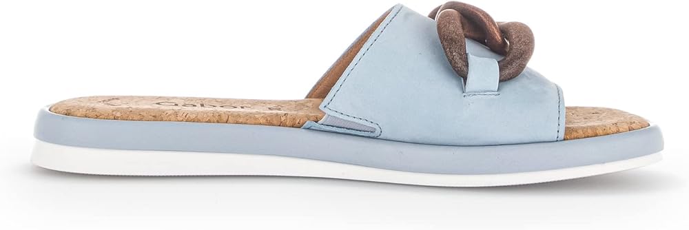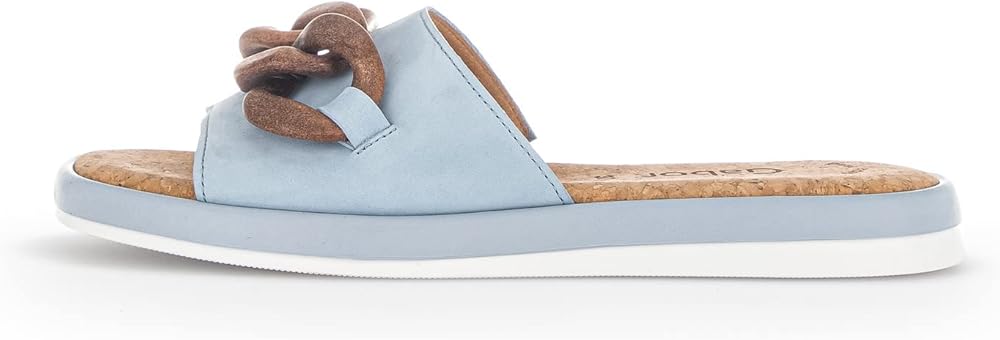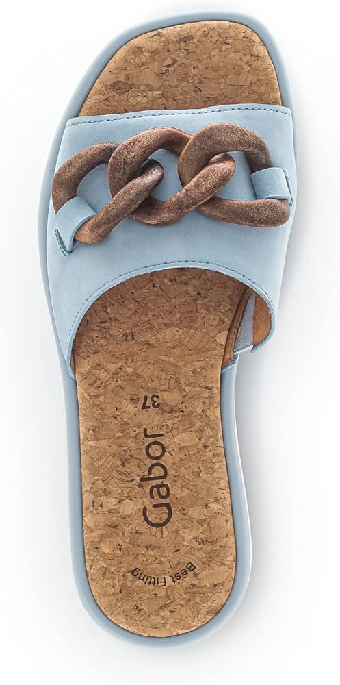 Keep your feet stylish by donning the classic and comfortable design of the refreshing Gabor Gabor 24.510 flats. Leather upper. Leather lining and synthetic insole. Slip-on style. Round, open toe construction. Chunky link chain accent on the vamp. Cork-inspired midsole. Synthetic outsole.