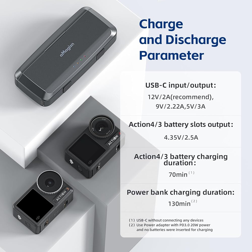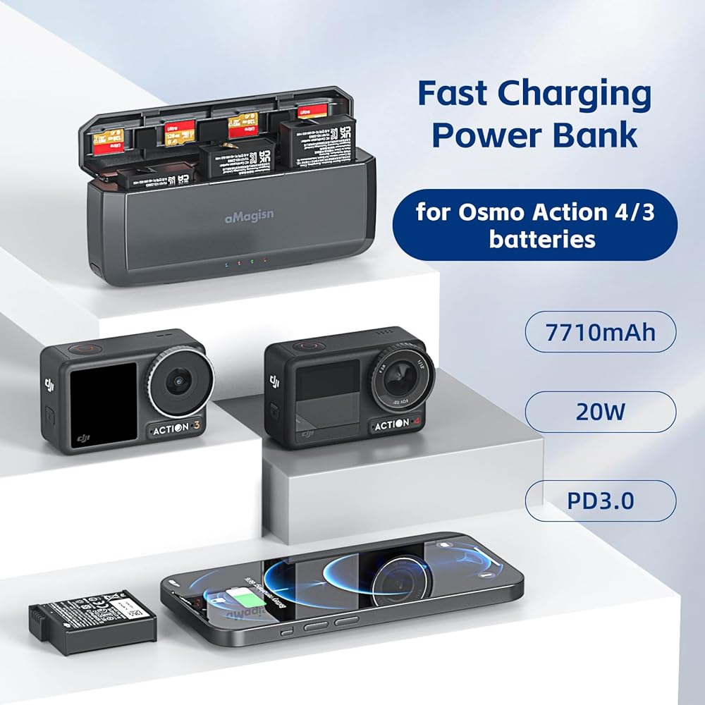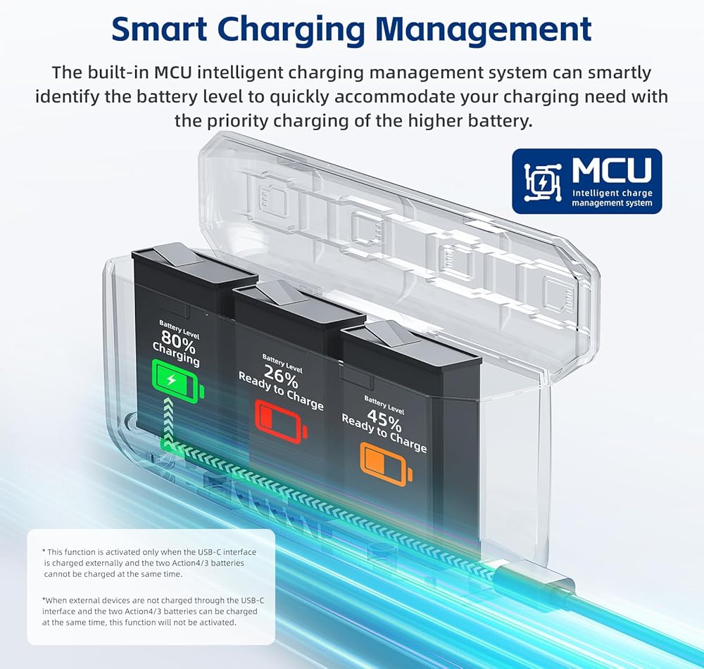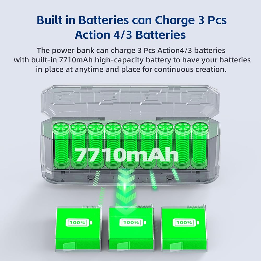 Battery Charging Case for DJI Osmo Action 4/3: The DJI Osmo Action 4/3 fast battery charger hub can quickly fully charge 3 batteries simultaneously at maximum power in just 2.5 hours, ensuring that your DJI Osmo Action 4/3 action camera is always powerful. Package Included: 1* aMaiMingji DJI Osmo Action 4/3 Charger Hub 1* Tape-C Charging Cable. ??? (Note: DJI Osmo Action 4/3 batteries are not included)