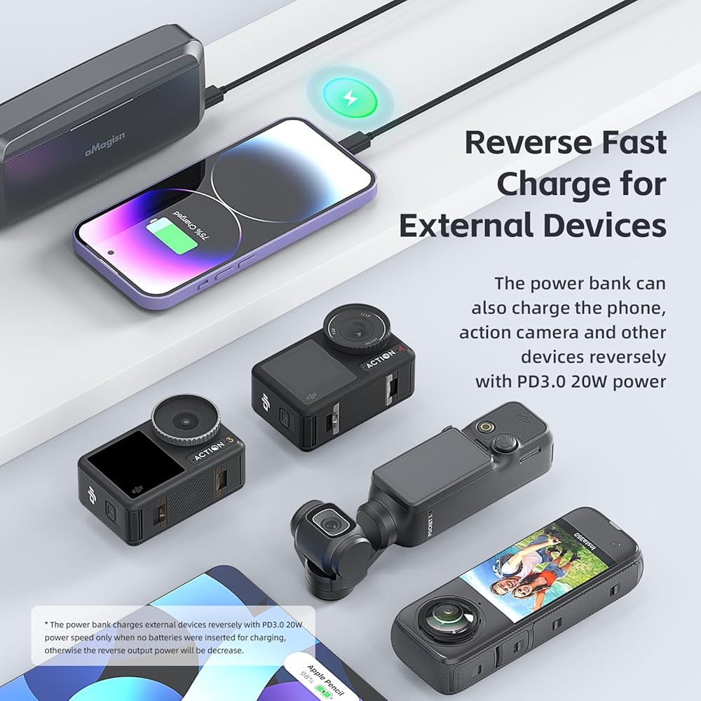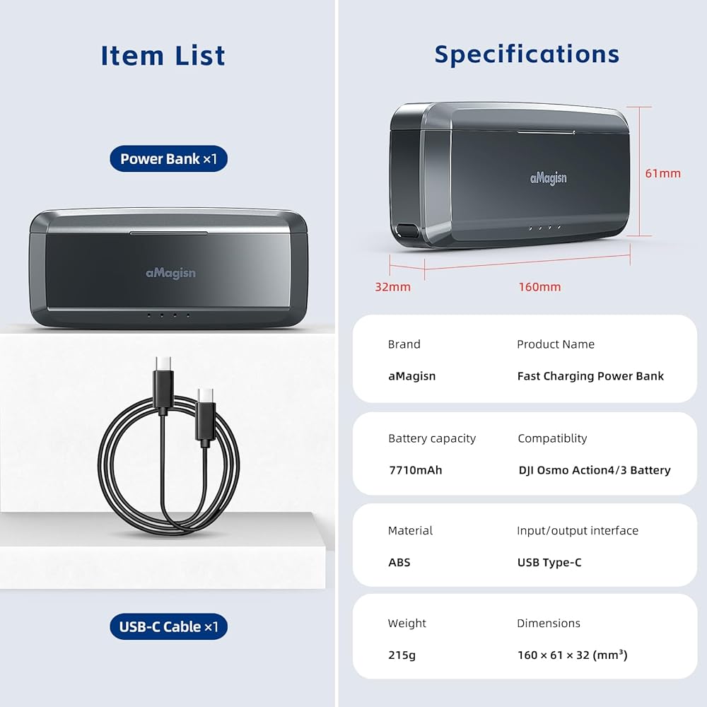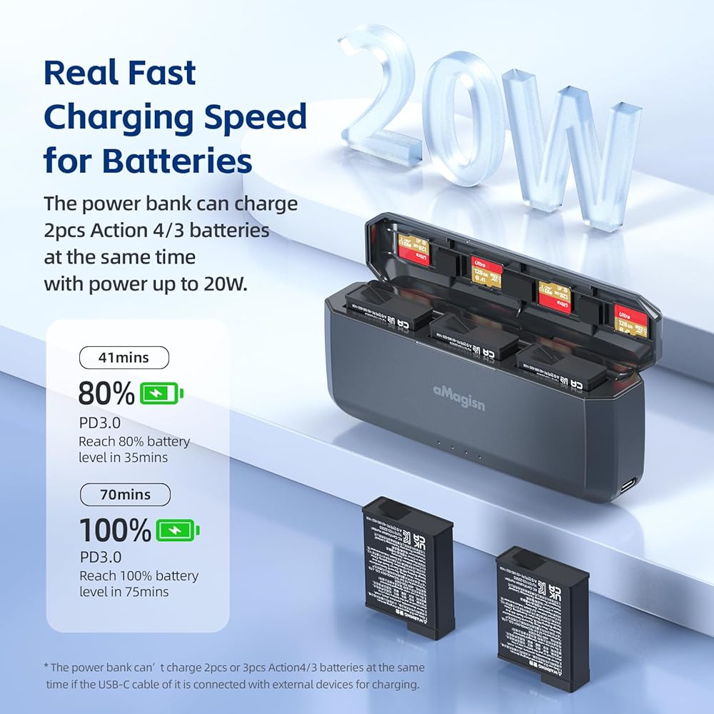 Battery Charging Case for DJI Osmo Action 4/3: The DJI Osmo Action 4/3 fast battery charger hub can quickly fully charge 3 batteries simultaneously at maximum power in just 2.5 hours, ensuring that your DJI Osmo Action 4/3 action camera is always powerful. Package Included: 1* aMaiMingji DJI Osmo Action 4/3 Charger Hub 1* Tape-C Charging Cable. ??? (Note: DJI Osmo Action 4/3 batteries are not included)