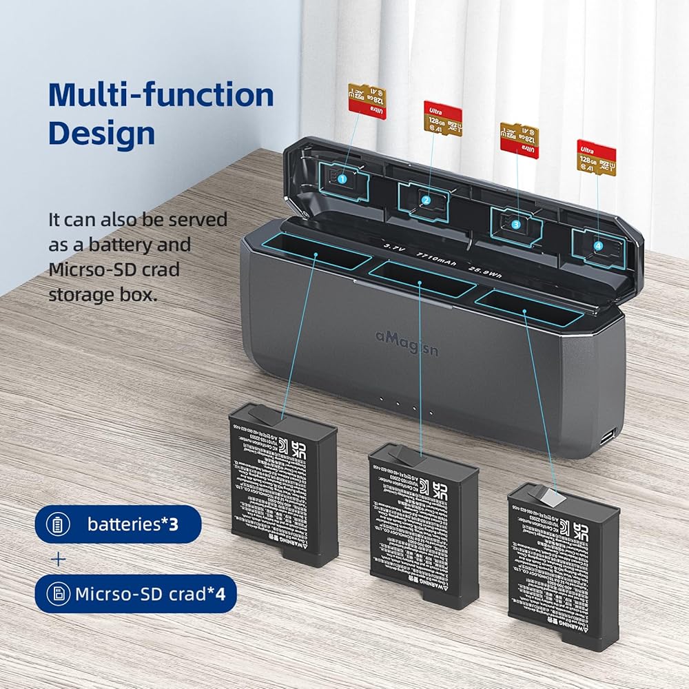 Dual-function for DJI Osmo Action 4/3 Charger Case: The DJI Osmo Action 4/3 fast charger hub can double as a space storage box for DJI Osmo Action 4/3 batteries and can charge 3 batteries efficiently simultaneously, saving charging time. Replacement DJI Osmo Action 4/3 battery box with built-in 3 Micro SD card storage slots to save storage and prevent loss.