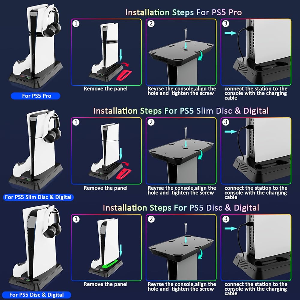 • 【Multi-Version Compatibility】 This PS5 cooling station is designed to fit both the new PS5 Slim Disc & Digital editions as well as the classic PS5 Disc & Digital models. The built-in cable and screw ensure a secure installation, providing stable positioning (Please remove the panel for installation on the PS5 Slim version).