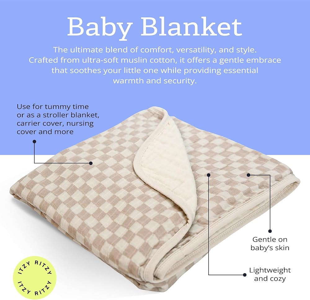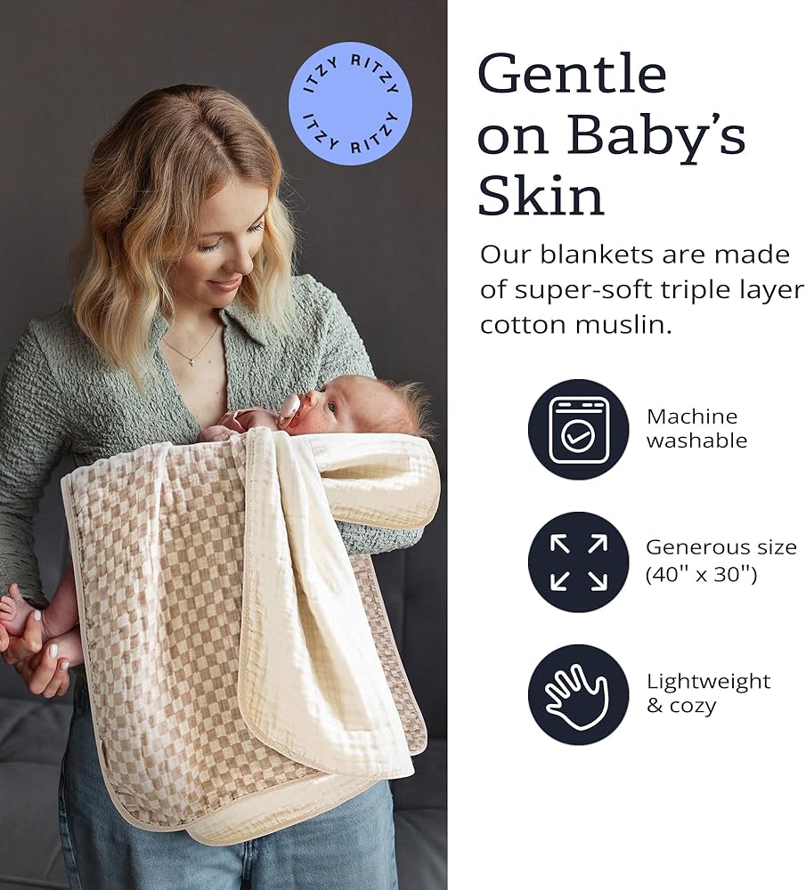 • SOFTNESS THAT SOOTHES: Wrap your baby in the irresistibly soft embrace of 100% cotton muslin. Designed to be gentle on delicate skin, the Itzy Ritzy Muslin Baby Blanket serves as a cozy receiving blanket that provides breathable, cloud-like comfort that will make snuggle time the best time, every time.