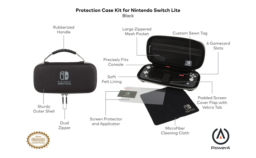 This sturdy case provides worry free storage and Protection for your Nintendo Switch Lite. Inside you'll find a felt lining and storage for six game cards and two microSD cards, plus zippered mesh pocket. Kit includes screen protector with applicator and cleaning cloth with Nintendo Switch logo. This portable case gives you the freedom to have fun on the go with your Nintendo Switch. Wherever. Whenever.