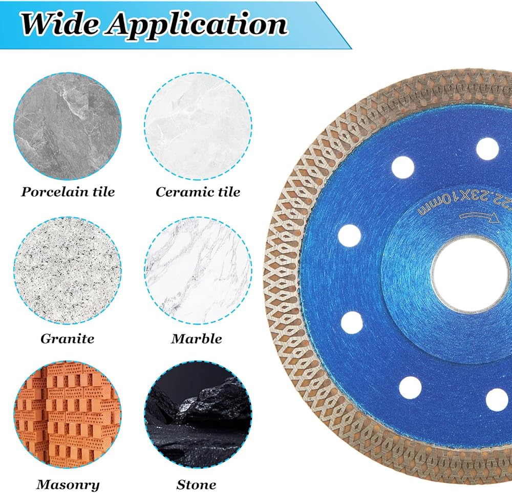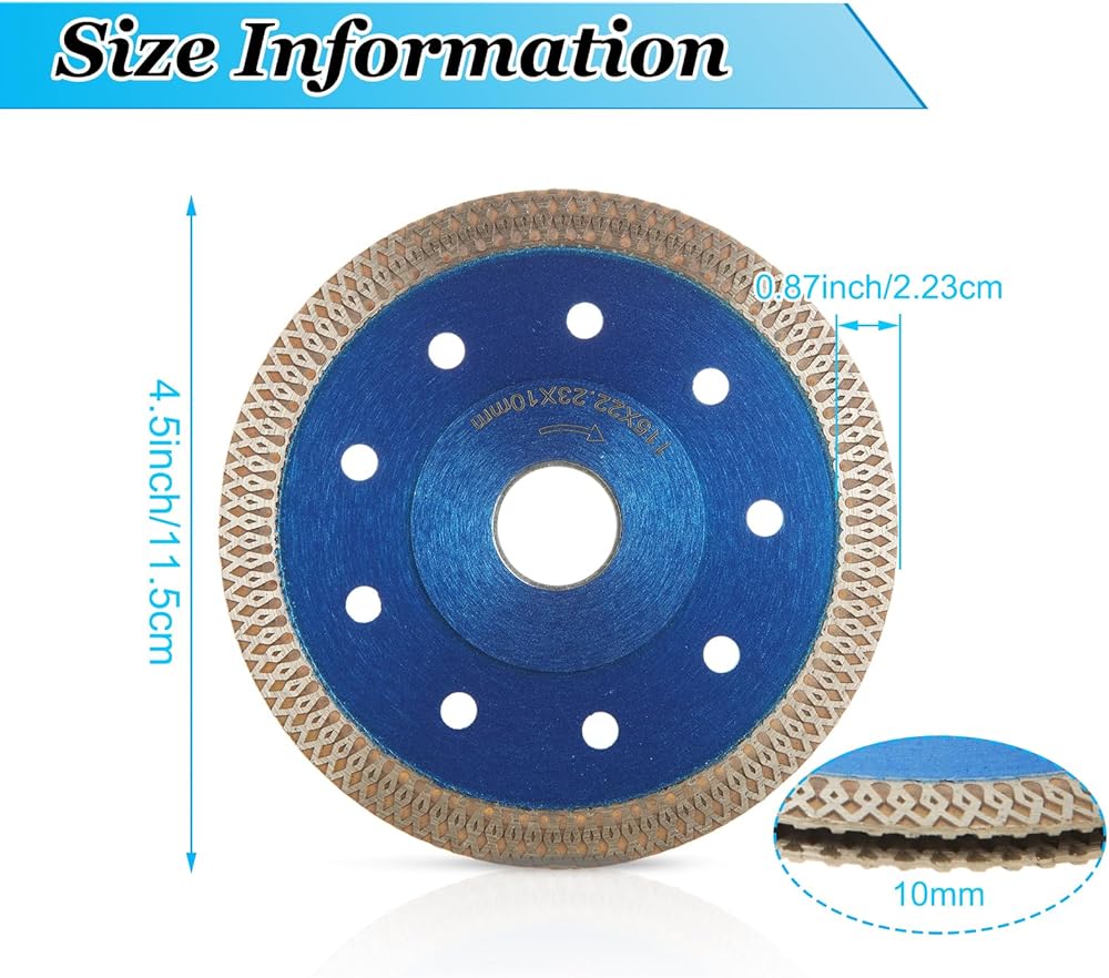 • Size - Outer diameter 115mm (4.5 inch), thickness 1.2mm, tooth width 10mm. Suitable for most tile saws and hand-held angle grinders with a 7/8" Arbor