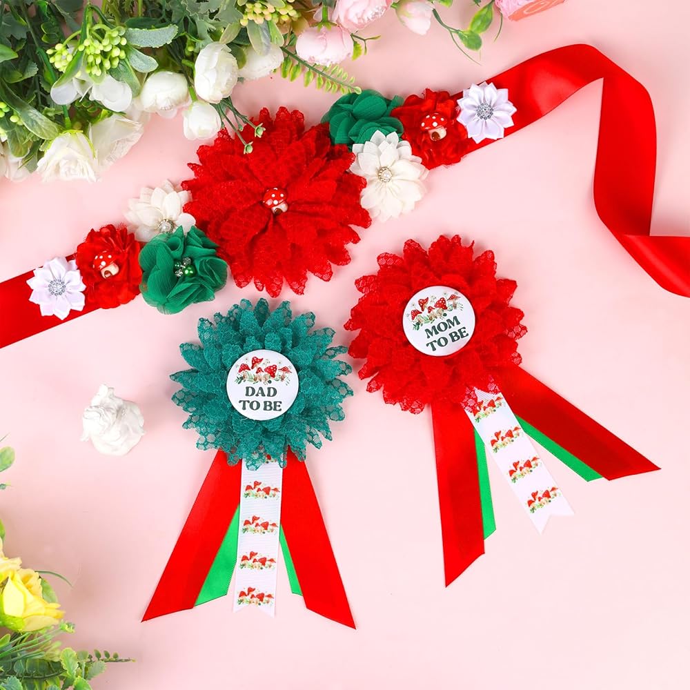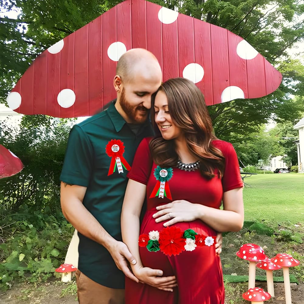 طقم وشاح الأمومة لاستحمام الطفل على شكل فطر - حزام بطن لحفلة استقبال المولود الجديد على شكل فطر وأمي ليكون وأبي ليكون دبابيس الصدار، أحمر وأخضر للآباء الجدد صور الحمل لوازم الحفلات