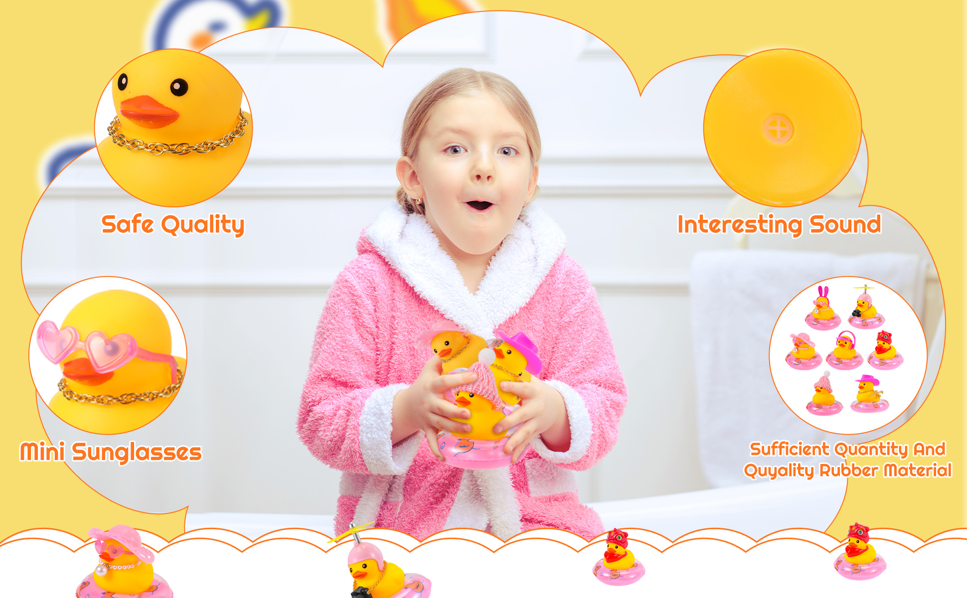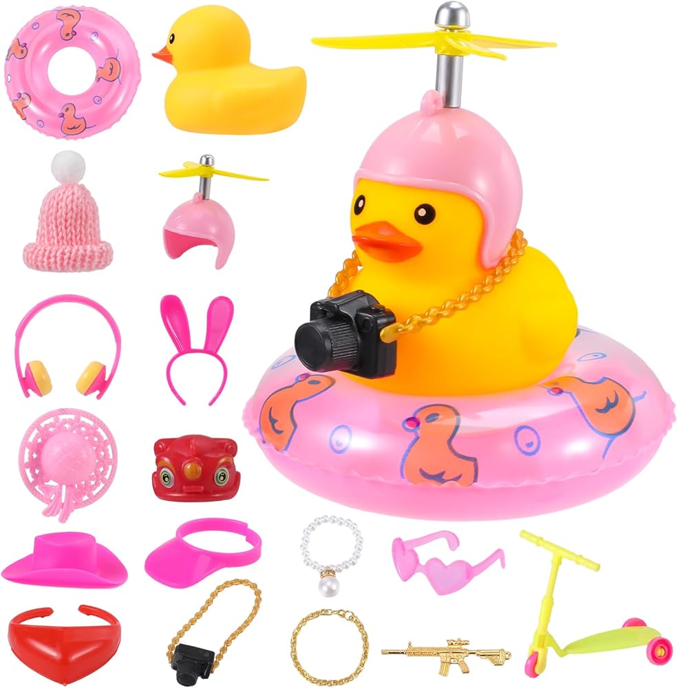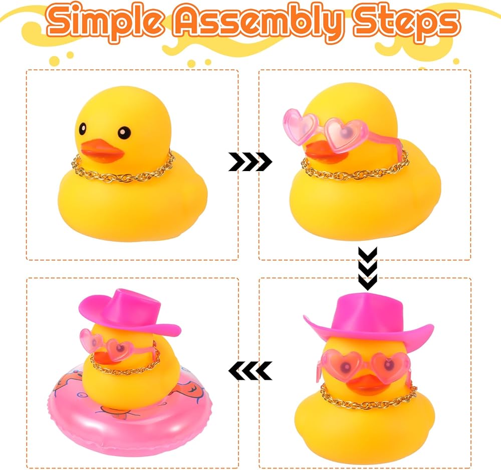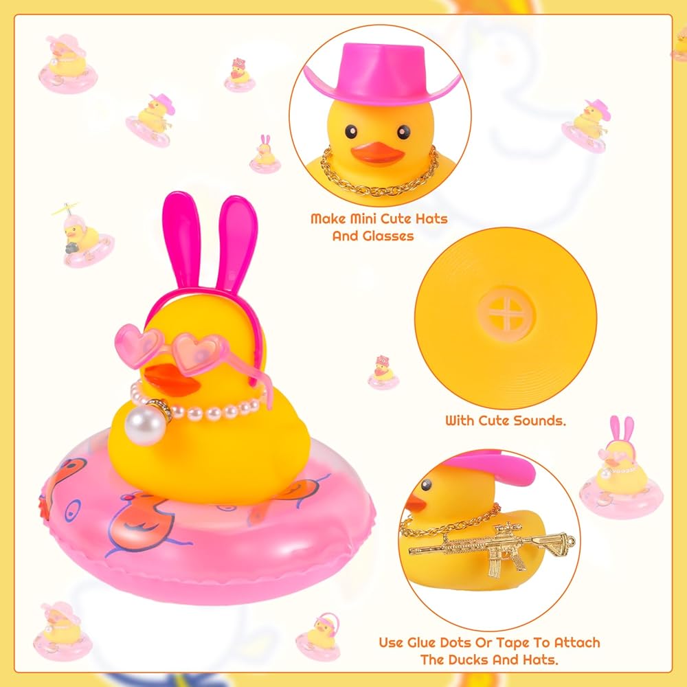 زينة على شكل بطة مطاطية للسيارة، زينة على شكل بطة رعاة البقر، لوحة قيادة السيارة مع إكسسوارات، قبعة صغيرة، قلادة، نظارات شمسية (وردي)